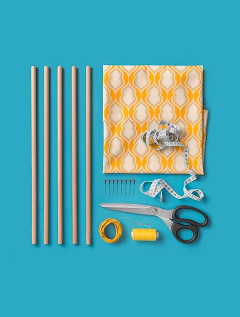 6. Naai alle stukken aan elkaar, zoom de boven en onderkant mooi af en steek de stokken door de lussen.
