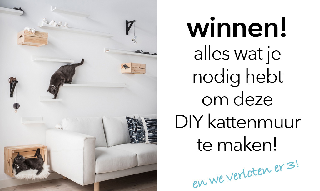 Maar daar kan verandering in komen! Want we verloten binnenkort 3x dit leuke prijzenpakket voor een DIY kattenmuur. Daarmee kun je bij je thuis helemaal zelf deze – slaap, speel en relax muur – maken.