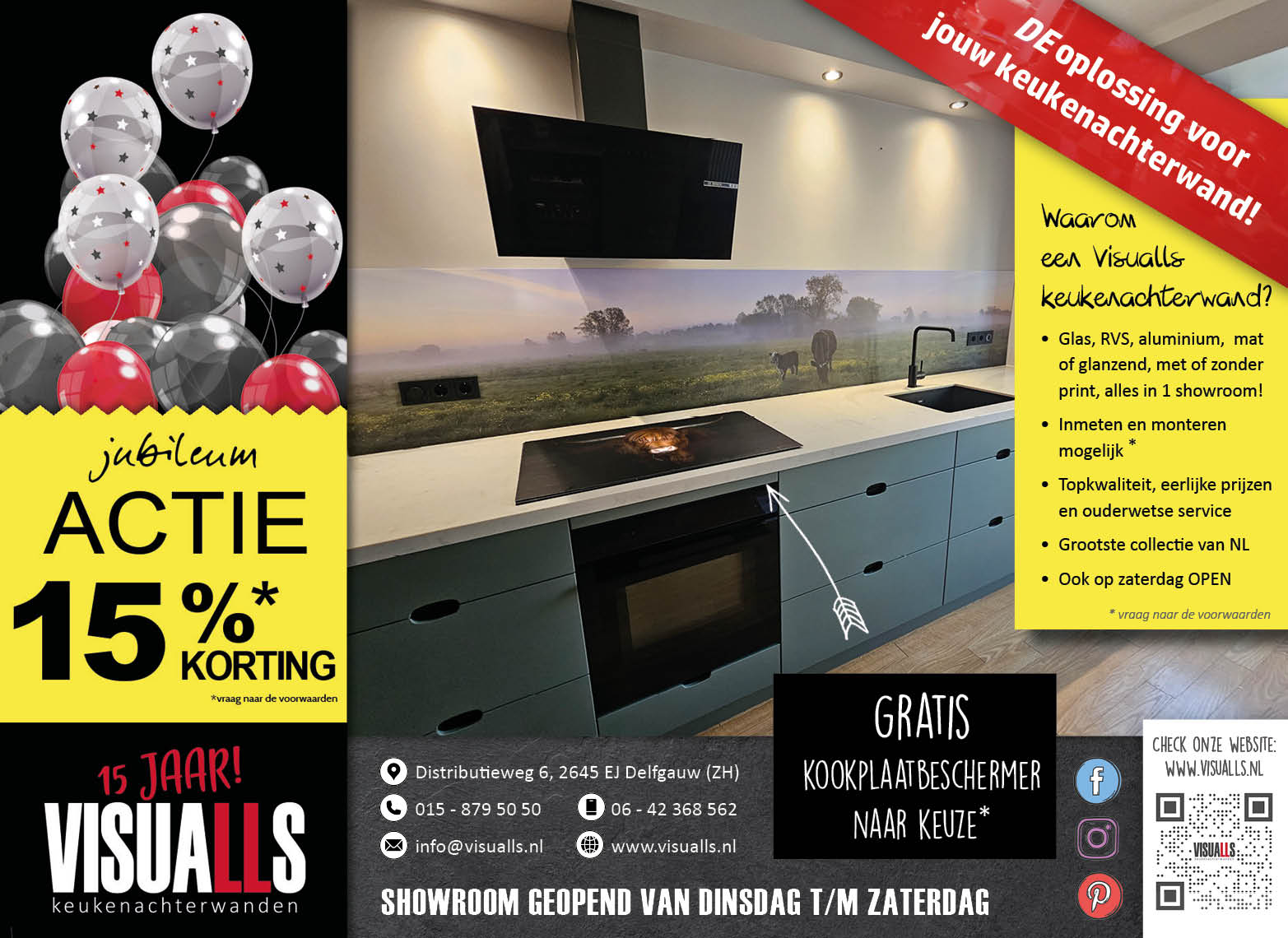 Visualls bestaat 15 jaar! Bestel je nu je keukenachterwand, dan profiteer je van 15% extra KORTING i.v.m. onze Jubileum-actie én als extra kadootje een inductie-kookplaatbeschermer t.w.v. €39,- helemaal GRATIS!