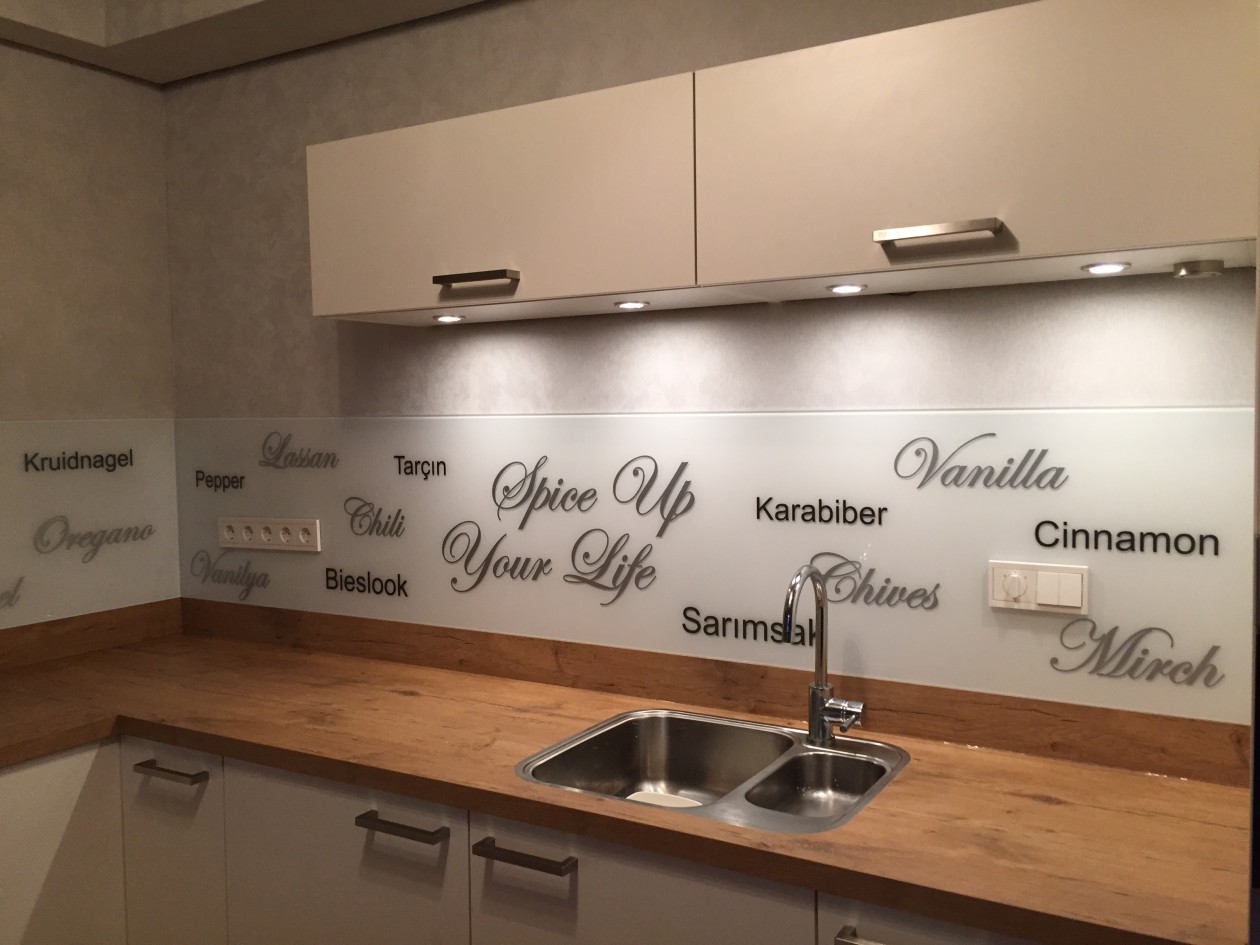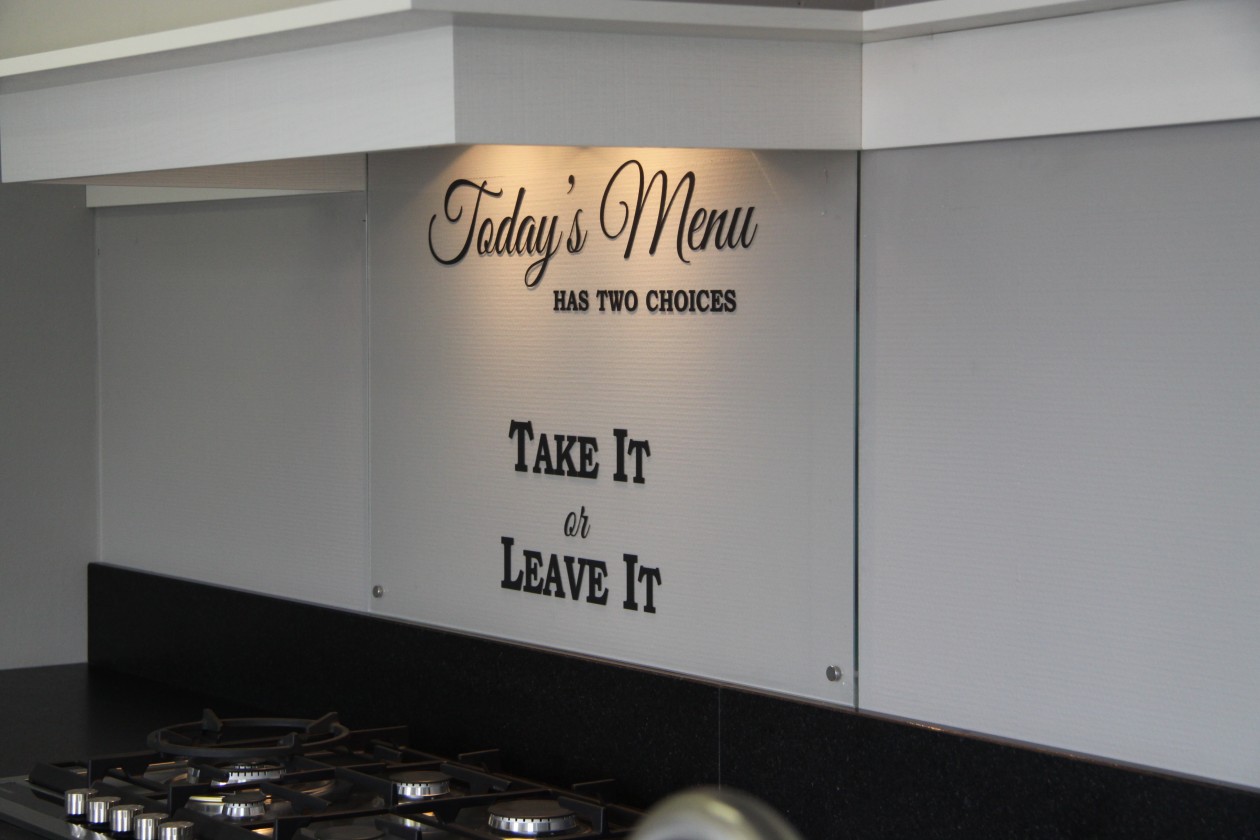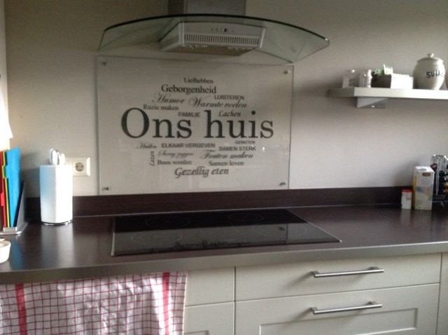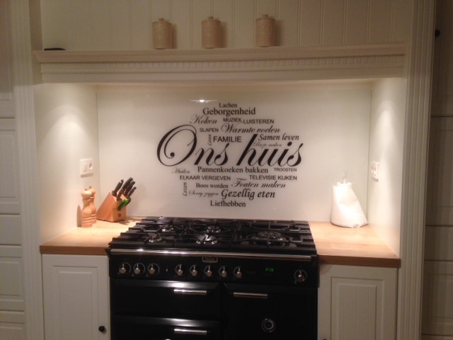 Speciale keukenachterwanden met (eigen-)tekst. Thermisch gehard glas kan direct achter de kookplaat en is leverbaar in alle RAL-kleuren. Uniek product van Visualls.nl