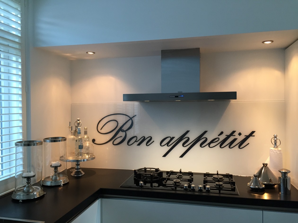 Speciale keukenachterwanden met (eigen-)tekst. Thermisch gehard glas kan direct achter de kookplaat en is leverbaar in alle RAL-kleuren én NCS-kleuren. Uniek product van Visualls.nl. Ook te bezichtigen in onze showroom in Delfgauw (Óók iedere zaterdag tot 16.00u open - aan de A13 tussen Rotterdam en Den Haag).