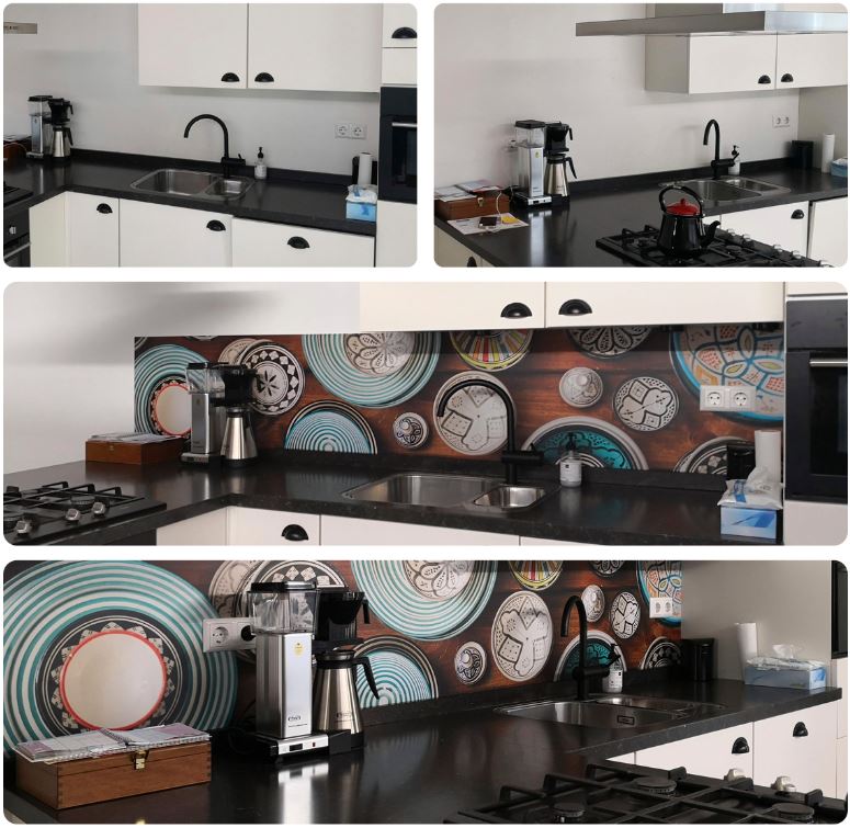 De foto's van de mozaïken keukenachterwand helemaal bovenaan dit artikel zijn ook gewoon vlakke, aluminium platen. Je ziet bijna niet dat het nep is.