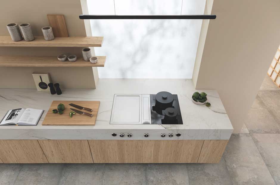 De traditionele afzuigkap werd vervangen door onbeperkte ontwerpvrijheid, vrij zicht, stille kookervaringen én schone lucht. BORA laat kookdampen, -geuren en vetdeeltjes namelijk niet eerst opstijgen, maar zuigt deze direct af waar ze ontstaan: bij het kookveld, recht uit de pan of grill.