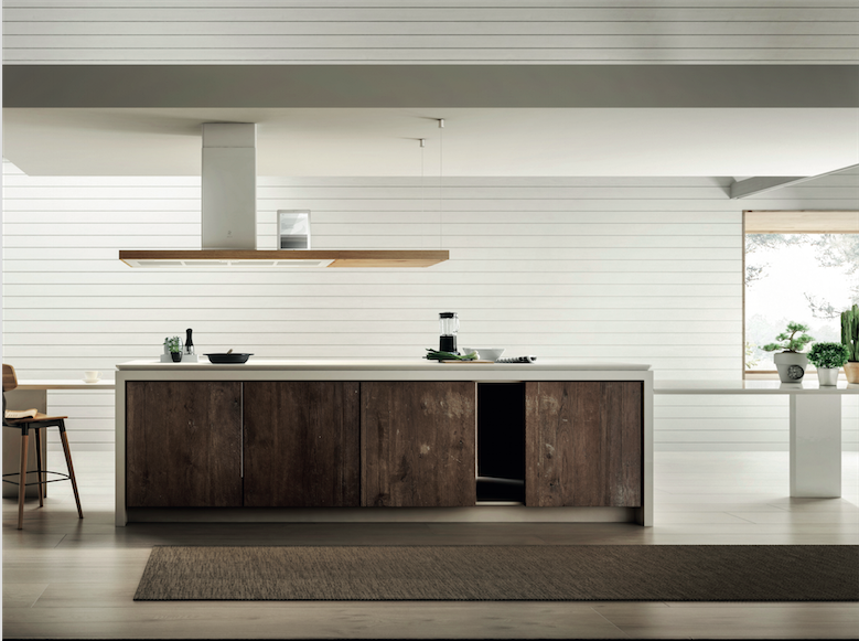 Bio eiland afzuigkap - wit gecombineerd met klassiek hout. Uitgevoerd met touch control en LED-verlichting.