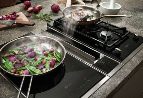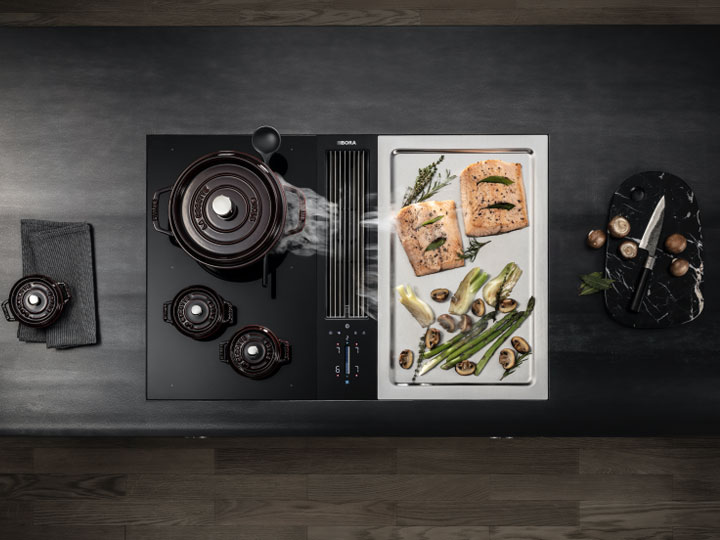 Het bereiden van voedzame, smakelijke maaltijden wordt gemakkelijk gemaakt met de BORA-kookplaat, inclusief de BORA Tepan roestvrijstalen grill als een van de modulaire kookplaten.