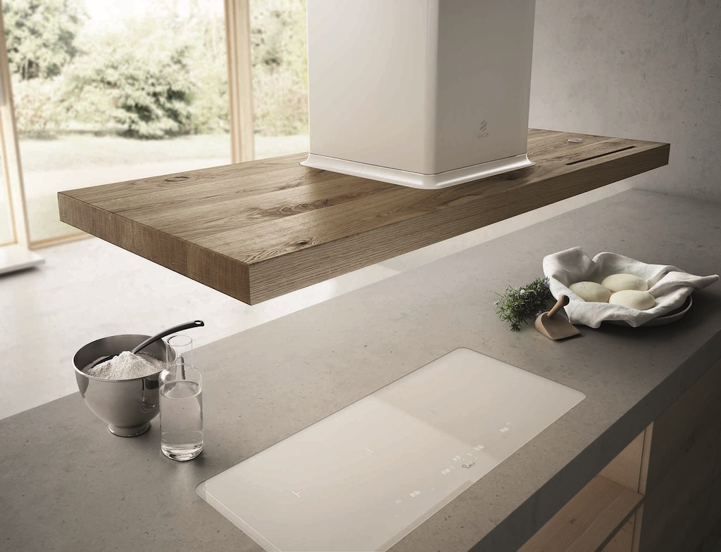 De robuustheid van een aanrechtblad van beton laat zich prachtig combineren met de natuurlijke uitstraling van hout. Deze mooie afzuigkap is van Elica en komt uit de Bio serie en is ook in een wanduitvoering verkrijgbaar. Een leuk extraatje is, dat de je de verlichting kunt afstemmen naar je eigen behoefte. De led verlichting kan worden bijgesteld van helder wit tijdens het koken, naar warm geel als je gezellig zit te eten.