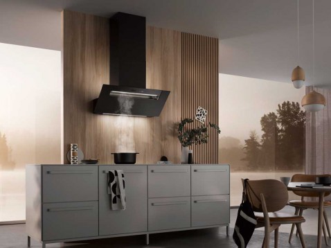 De Downdraft afzuigkap past zich eenvoudig aan op de wensen van de kok. De zwarte, glazen plaat in een roestvrijstalen frame komt op commando omhoog tot een maximale hoogte van 40 centimeter. Na gebruik zakt de kap weer terug in het aanrecht waar hij bedekt wordt door een zwart, glazen paneel. Dit frame sluit perfect aan bij de keramische kookplaten die steeds vaker worden gebruikt.