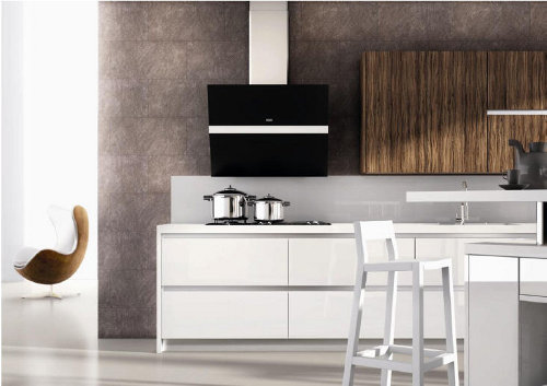 De Swing-afzuigkappen zijn ideaal voor wie een design statement in de keuken in roestvrijstaal en zwart of wit glas wil maken. Het bovenste, glazen gedeelte verbergt de filters. Twee halogeen spots van 20 Watt zorgen voor een sfeervolle verlichting in de keuken, een energiebesparende 10 Watt LED lichtbalk voor verlichting van het kookveld.