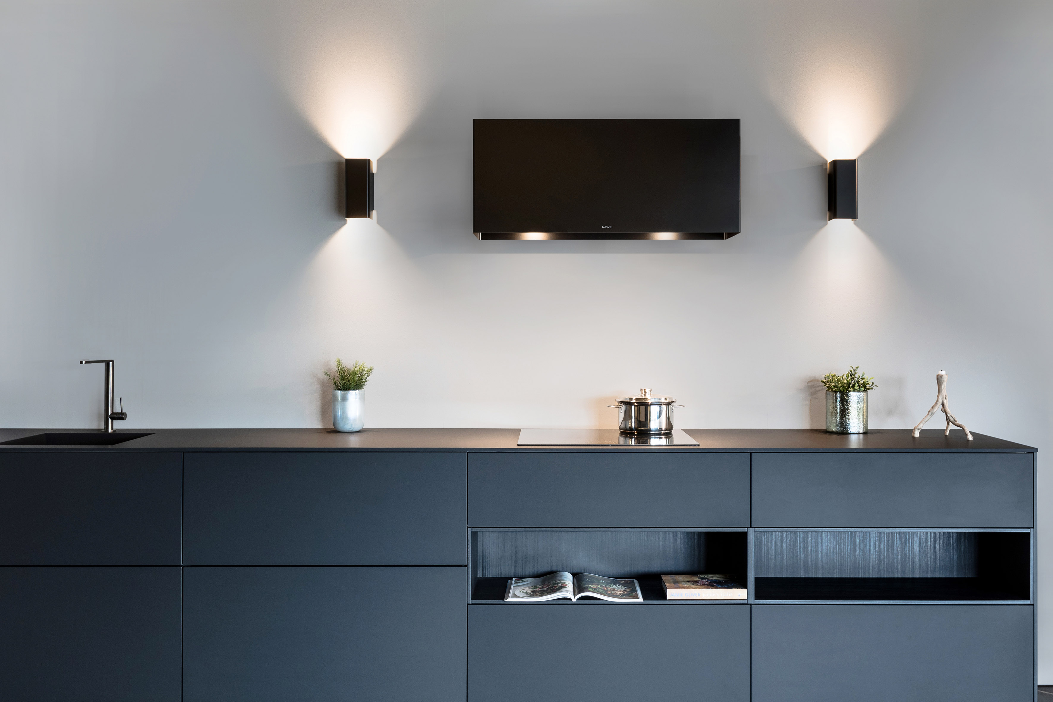 De wand modellen van Wave hebben geen verbinding met het plafond. Er zijn zelfs modellen die geen verbinding met de wand lijken te hebben. De afzuigkap voegt zich hierdoor als een natuurlijk element aan de overige meubelstukken in de keuken. Sfeervolle verlichting, kleuren materiaal combinaties en de verfijnde afwerking maken de afzuigkap tot een eyecatcher.