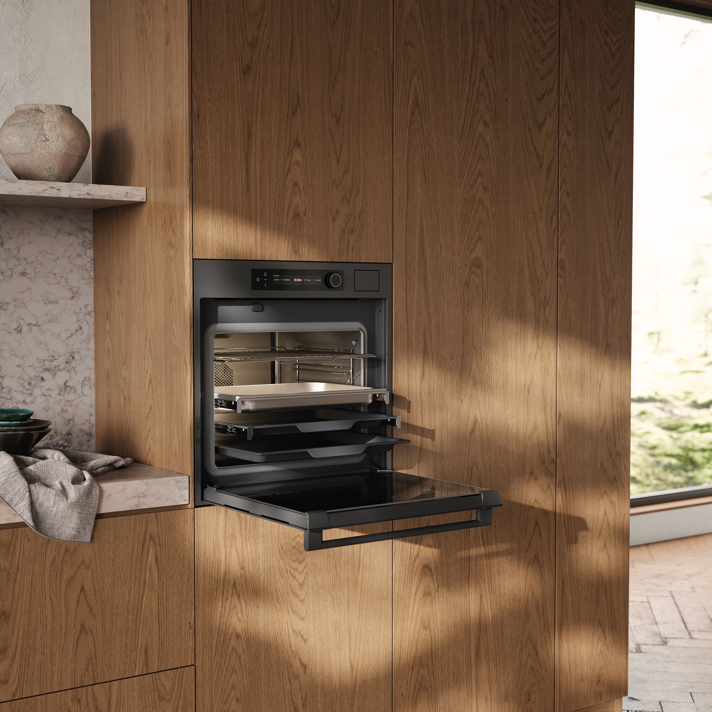 Kiest men voor de stoomoven, dan zorgt de geavanceerde ProSteam stoomfunctie, die automatisch stoom en temperatuur regelt, voor behoud van vitaminen, mineralen en textuur. Nieuw is de reductiefunctie, die voorkomt dat stoom of warmte je tegemoetkomt bij het openen van de deur. Bovendien voorkomt het een beslagen raam tijdens het kook- en bakproces.