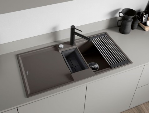 BLANCO ADIRA scoort niet alleen punten in functionaliteit. De prachtige Silgranit® tinten variëren van koffiebruin en energiek zwart tot romig tartufo en warm vulkanisch grijs. BLANCO ADIRA past dus harmonieus tot contrasterend in bijna elke keukenomgeving. Silgranit® laat al zijn visuele en praktische troeven zien. Het steenachtige oppervlak voelt heerlijk zacht aan, gaat mooi op in de omringende materialen van een BLANCO UNIT en straalt tijdloze elegantie uit met zijn matte look.