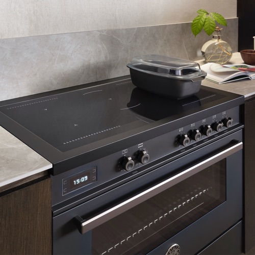 Het oog wil ook wat, en ook daarin stelt Bertazzoni niet teleur. Het elegante zwarte glas vormt een prachtig contrast met het robuuste gietijzeren rooster en de iconische messing accenten – subtiele details die karakter geven aan je keuken.