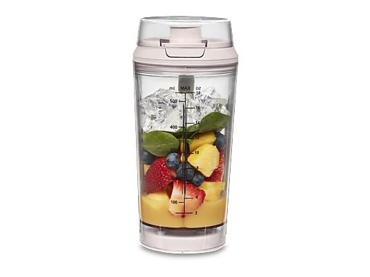 Blend direct in de 500 ml travel cup met lekvrije dop en draaglus. Hij past in je bekerhouder, sporttas en ochtendroutine.