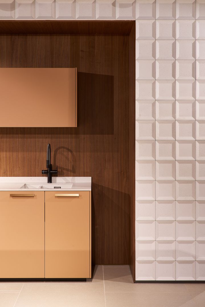 Centrale vormgevingskenmerken, die afhankelijk van de ruimtelijke omstandigheden in de Store kunnen variëren, leiden de blik doelbewust naar het product en creëren een aangename sfeer. De afgeronde scheidingswanden voeren bezoekers intuïtief door de showroom, terwijl geselecteerde wandtegels speciale accenten zetten: driedimensionale betontegels maken indruk met hun uitzonderlijke haptiek en innovatieve uitstraling, terwijl verticaal geplaatste rechthoekige tegels het rasterprincipe op een ordentelijke en heldere manier visualiseren. Wanden met intense kleuren, verlaagde rasterplafonds en verschillende gordijnen creëren een bijzonder ruimtelijk effect en zorgen voor een subtiele zone-indeling. Hoogwaardig meubilair, marketingdisplays en schermen die het merk-DNA van next125 communiceren, ronden het holistische concept op stijlvolle wijze af en ensceneren het merk in zijn totaliteit.