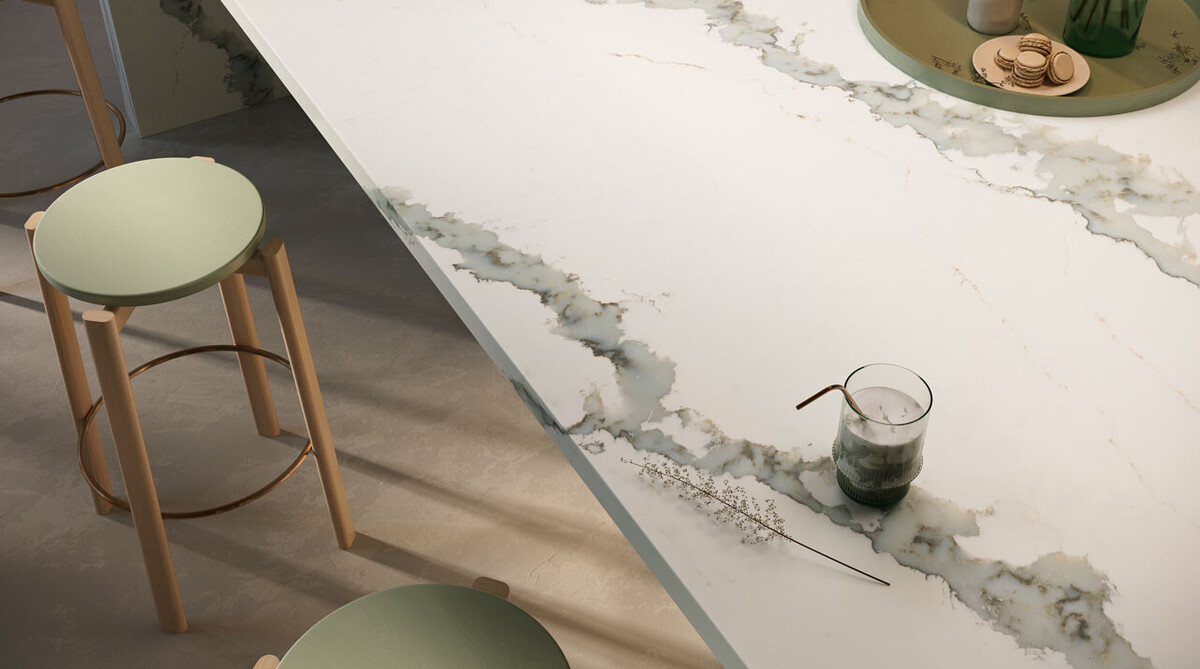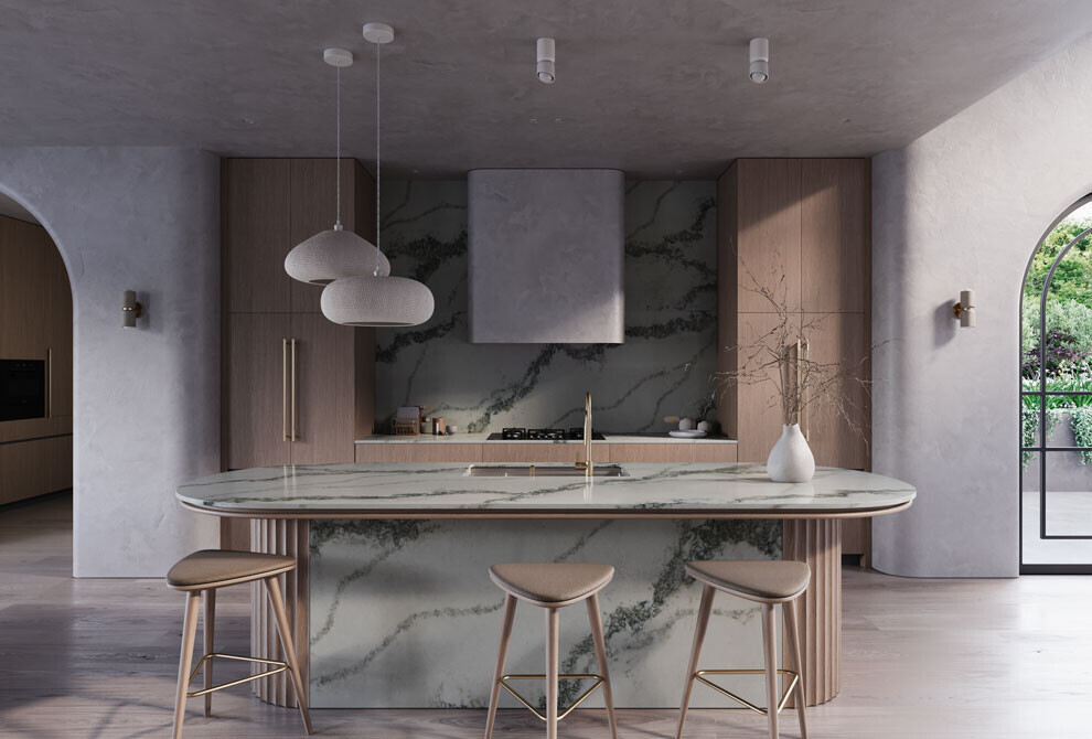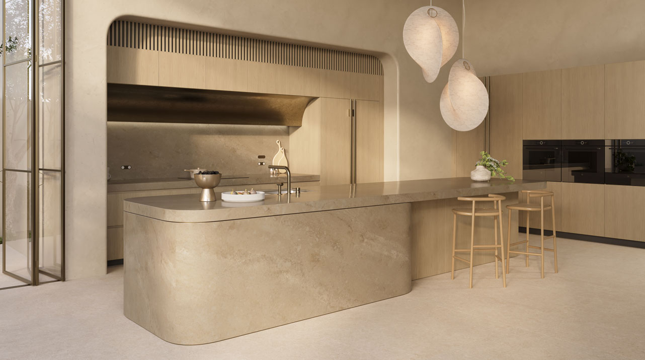 In het nieuwe jaar verschuift het kleurenpalet van koel en strak naar warm en aards. Mushroom-groen, zandtinten, taupe en lichte houtkleuren vormen de basis. Het zijn tinten die meebewegen met het daglicht: in de ochtend zacht en ’s avonds juist warm. Tegen deze achtergrond komt natuursteen tot leven. Het materiaal mag weer karakter tonen: uitgesproken aderen, natuurlijke patronen en texturen die bijna schilderachtig lijken. Bovendien blijft steen niet langer beperkt tot het werkblad. Het loopt door in achterwanden en nisjes, waardoor één elegant geheel ontstaat.