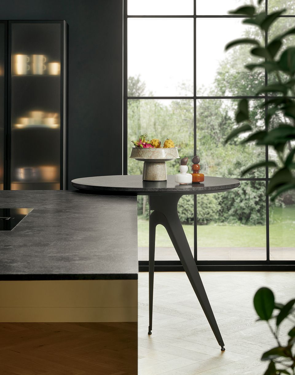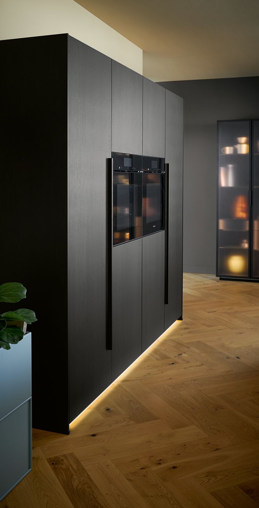 Achter dit ensemble vervult het keukenblok met hoge kasten in onyxzwart eikenfineer een subtielere rol, perfect passend bij het sfeervolle, holistische verlichtingsconcept van de keuken. Of het nu de plint, de greepopeningen of de binnenladen betreft – alles kan naar wens verlicht en geaccentueerd worden. Dit geldt ook voor de fraaie voorwerpen die een plek hebben gekregen achter de deuren van de vitrinekast met lineair glas en fijnstructuur.