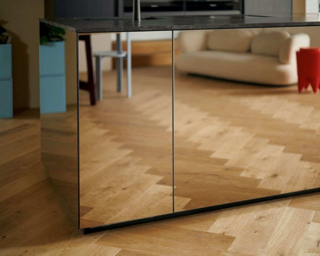 Het opvallende kookeiland, met zijn Tip-On-fronten van bronzen spiegelglas, vormt het middelpunt en geeft de hele ruimte een indrukwekkende diepte.