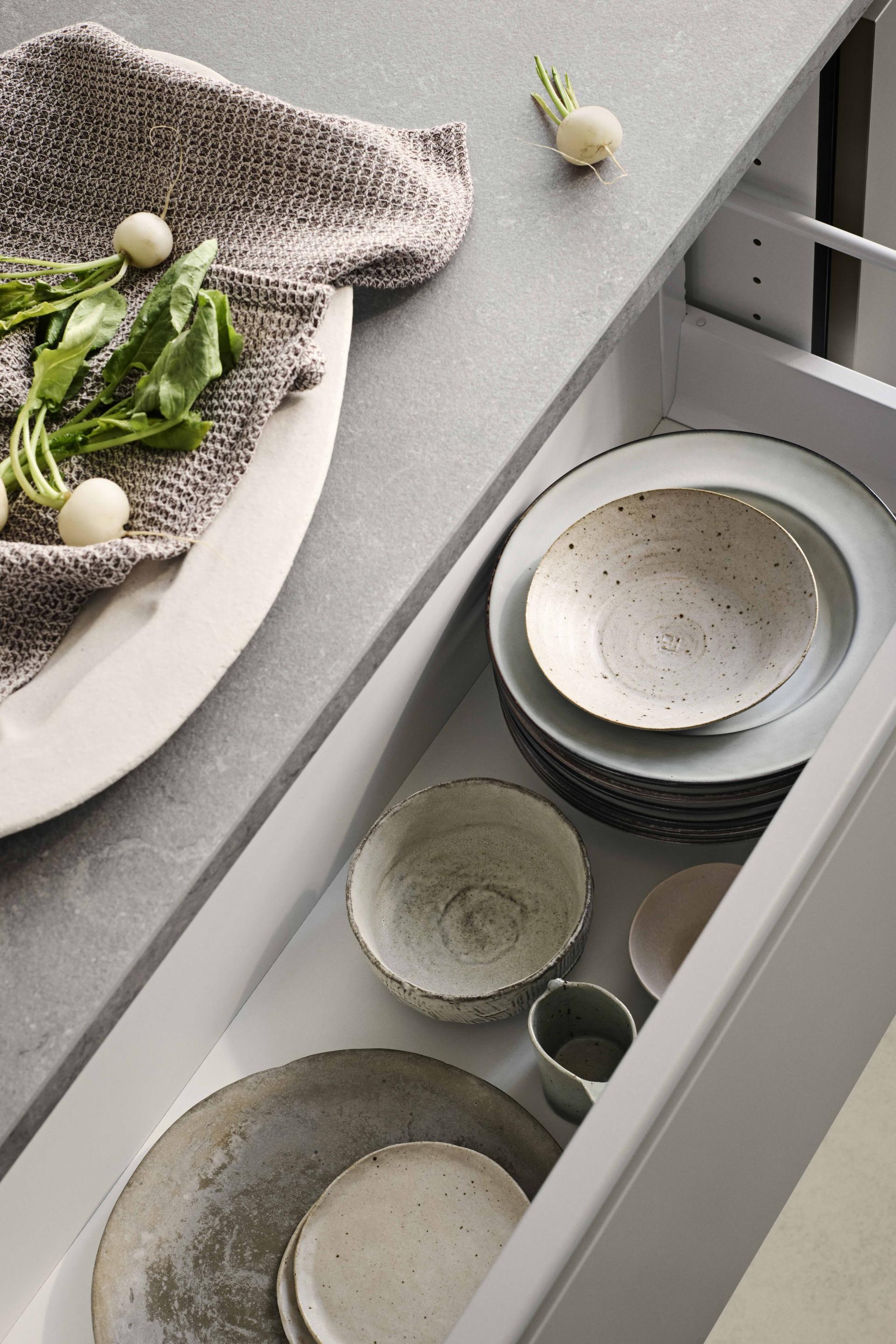 Claus Johnsen, hoofd design bij Kvik: "Compose is een prachtig voorbeeld van ons Leefkeuken-concept, waarbij de keuken het hart van je huis vormt. Volgens deze filosofie moet een keuken niet alleen stijlvol zijn, maar ook comfortabel en afgestemd op jouw persoonlijke woonwensen. Ons doel is een keuken te ontwerpen die perfect aansluit op jouw manier van leven." "De lades van Compose illustreren dat perfect," vervolgt Claus. "Je kunt kiezen uit twee of drie lades per blok, wat een maximale ontwerpvrijheid geeft om de keuken volledig af te stemmen op jouw behoeften en voorkeuren." Dankzij het slimme gebruik van de plintzone bieden de XL-kasten tot 15% meer opbergruimte dan standaard onderkasten. Voor wie nog meer ruimte nodig heeft is de XXL-variant beschikbaar. Dit levert tot wel 40% extra opbergruimte op, ideaal voor grote gezinnen of kookliefhebbers die geen ruimte willen laten liggen.