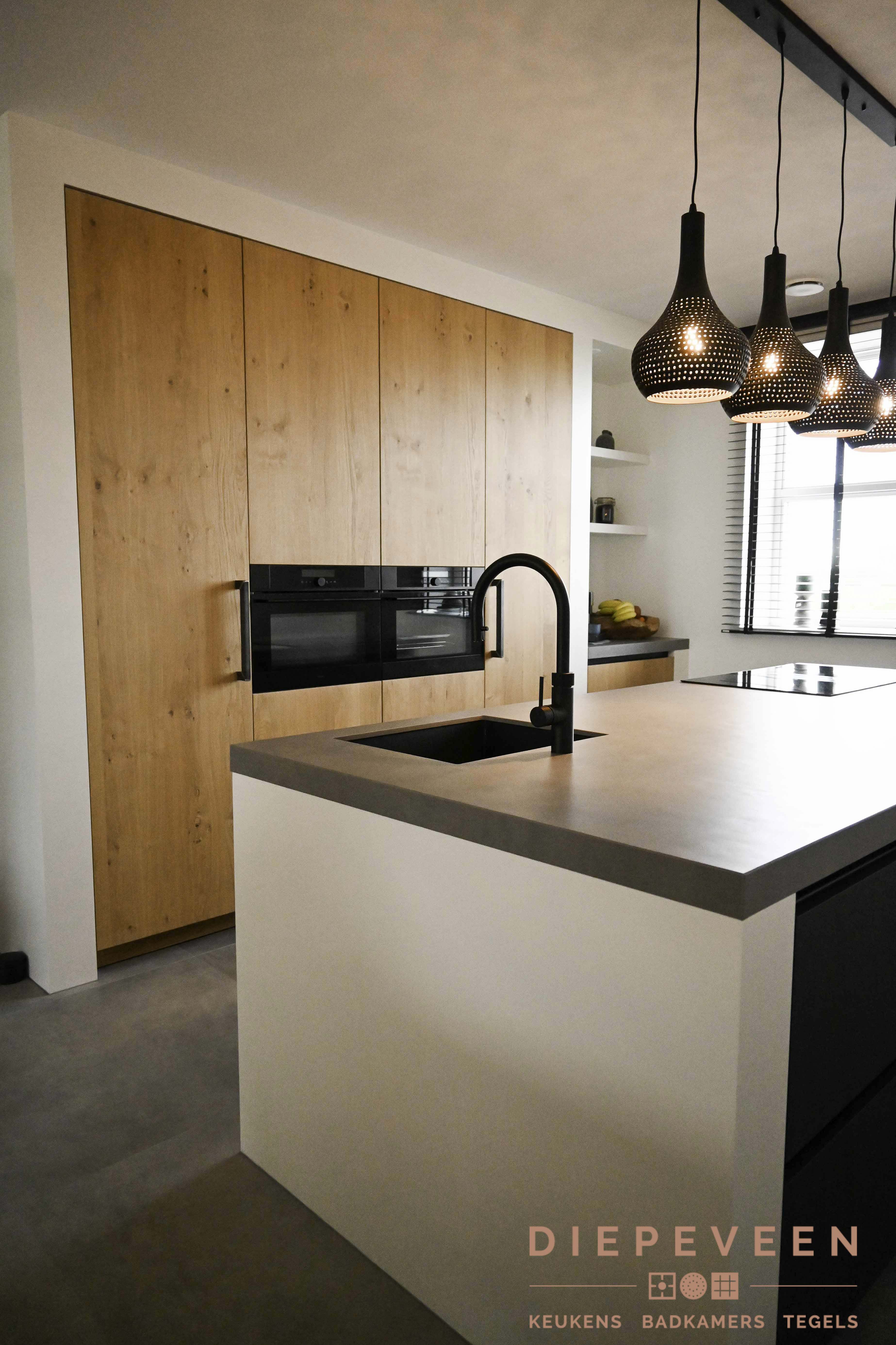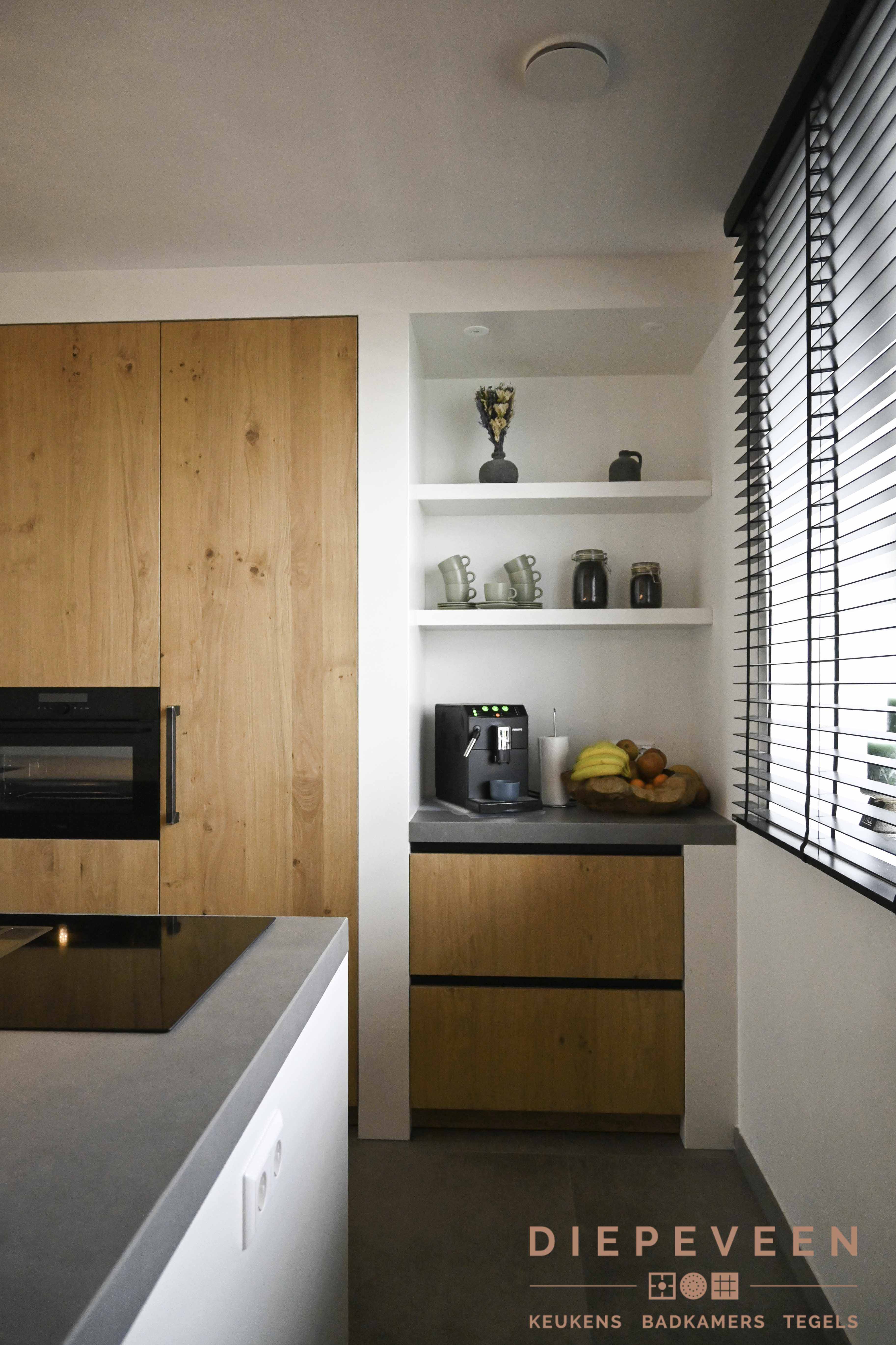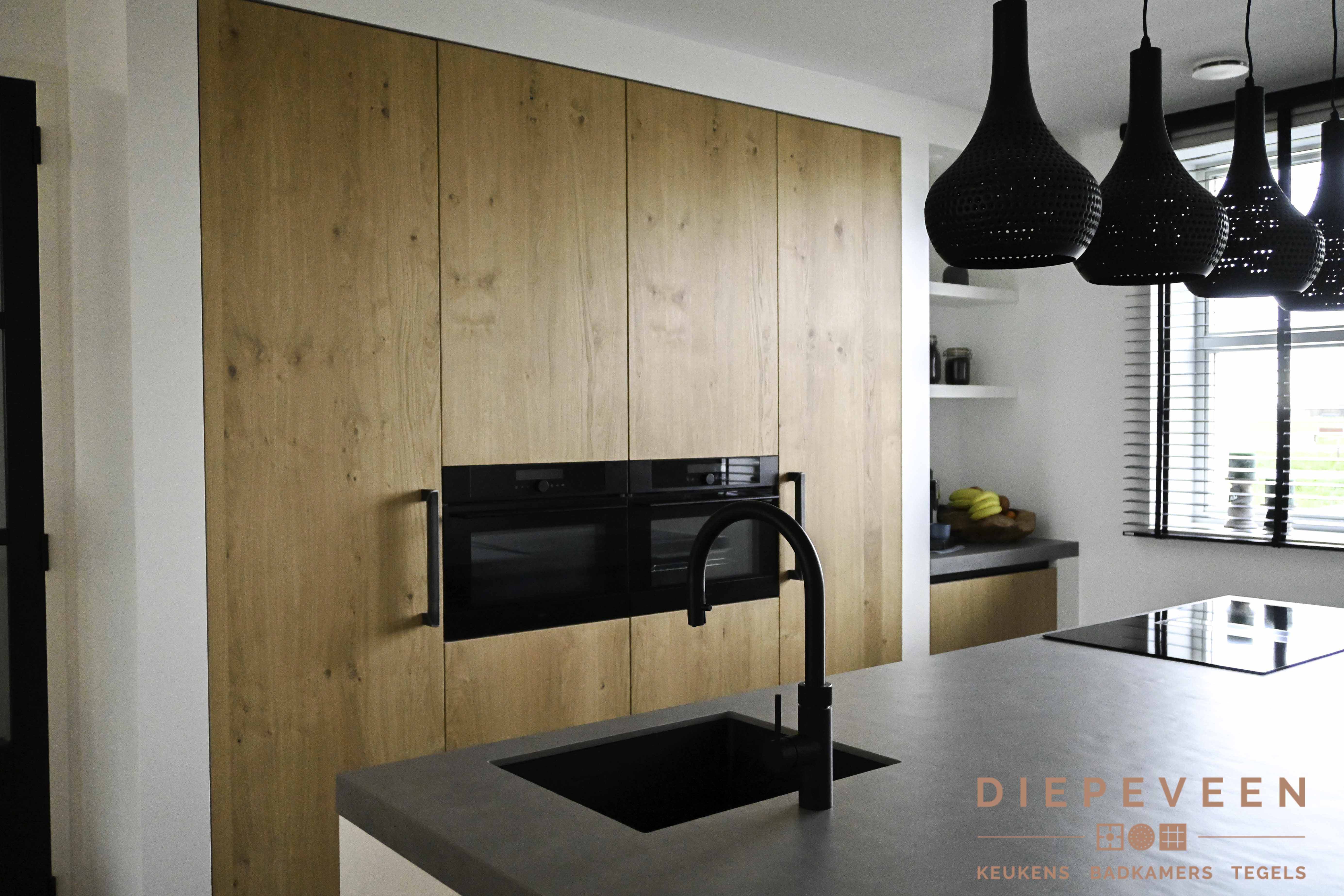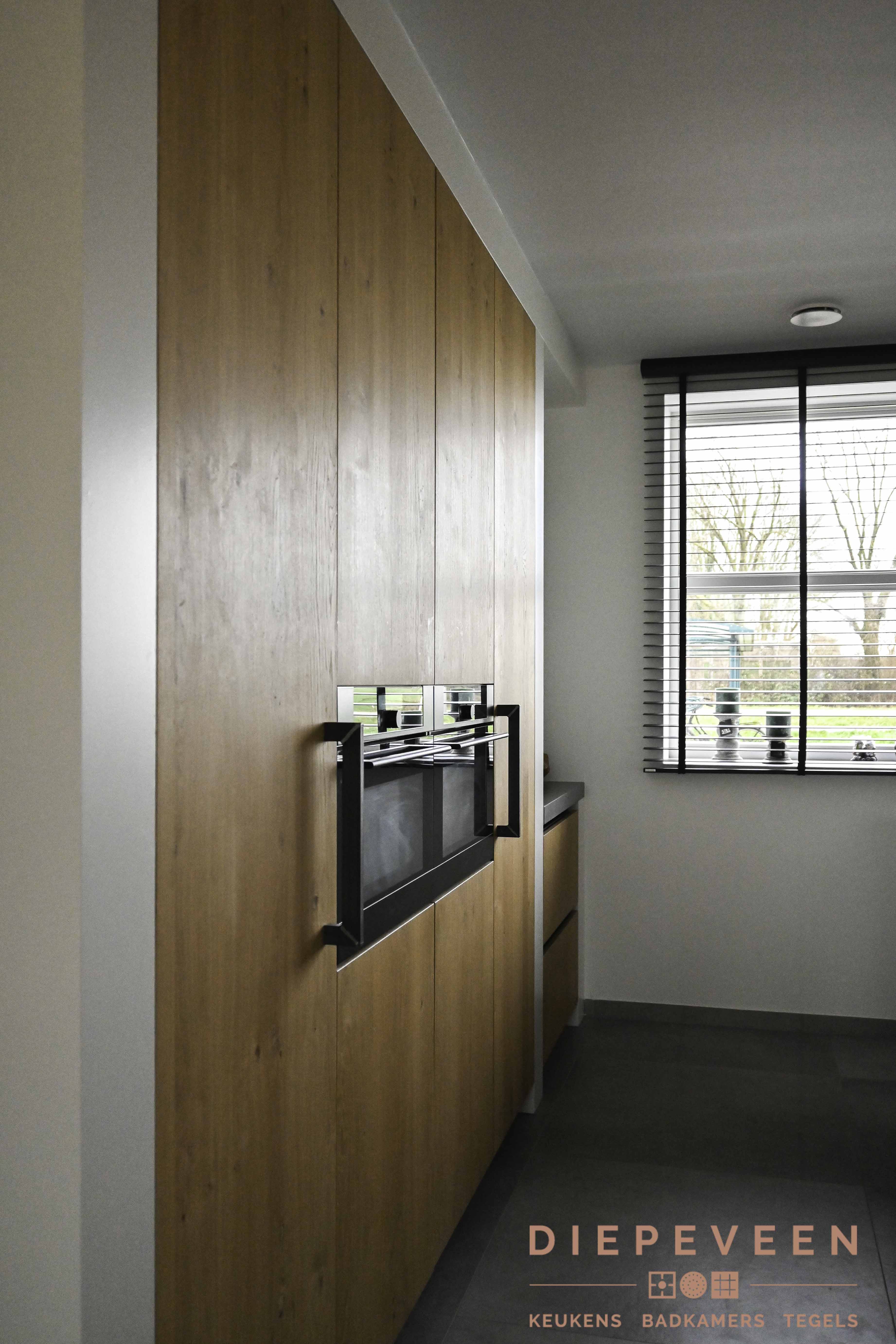 Bij deze keuken is er gekozen voor eiken geborstelde fronten gecombineerd met een grijs werkblad. De keuken krijgt een extra moderne uitstraling door de greep loze kasten.