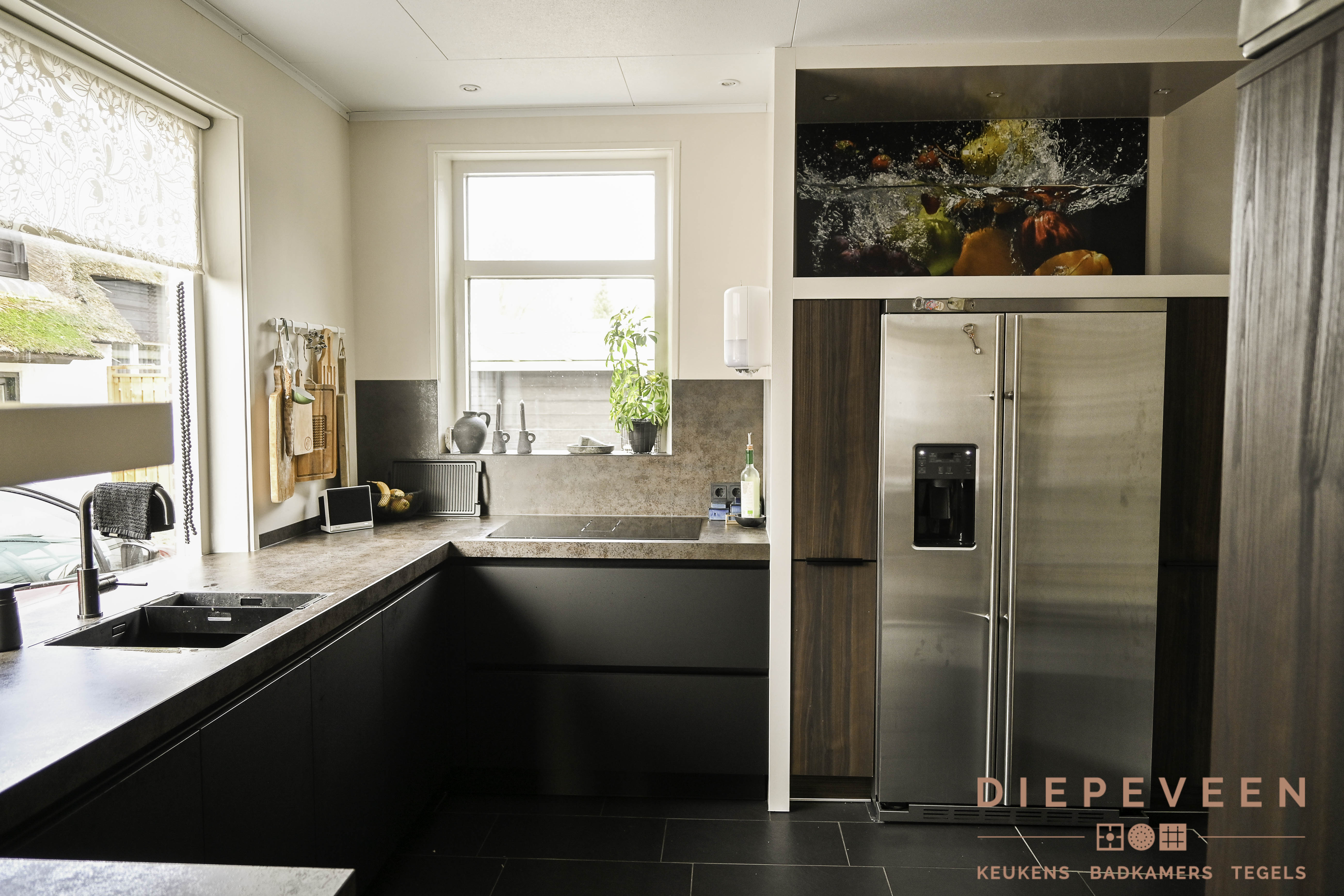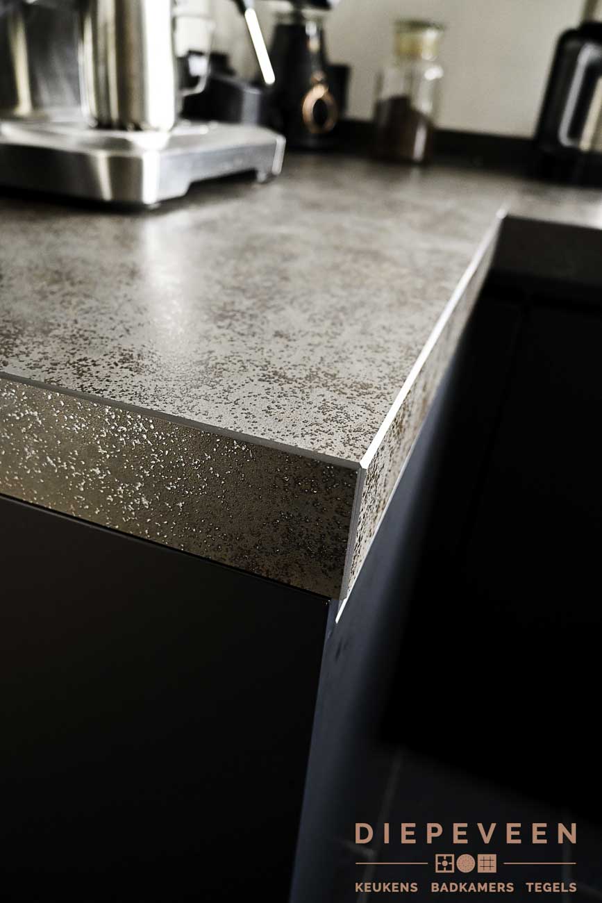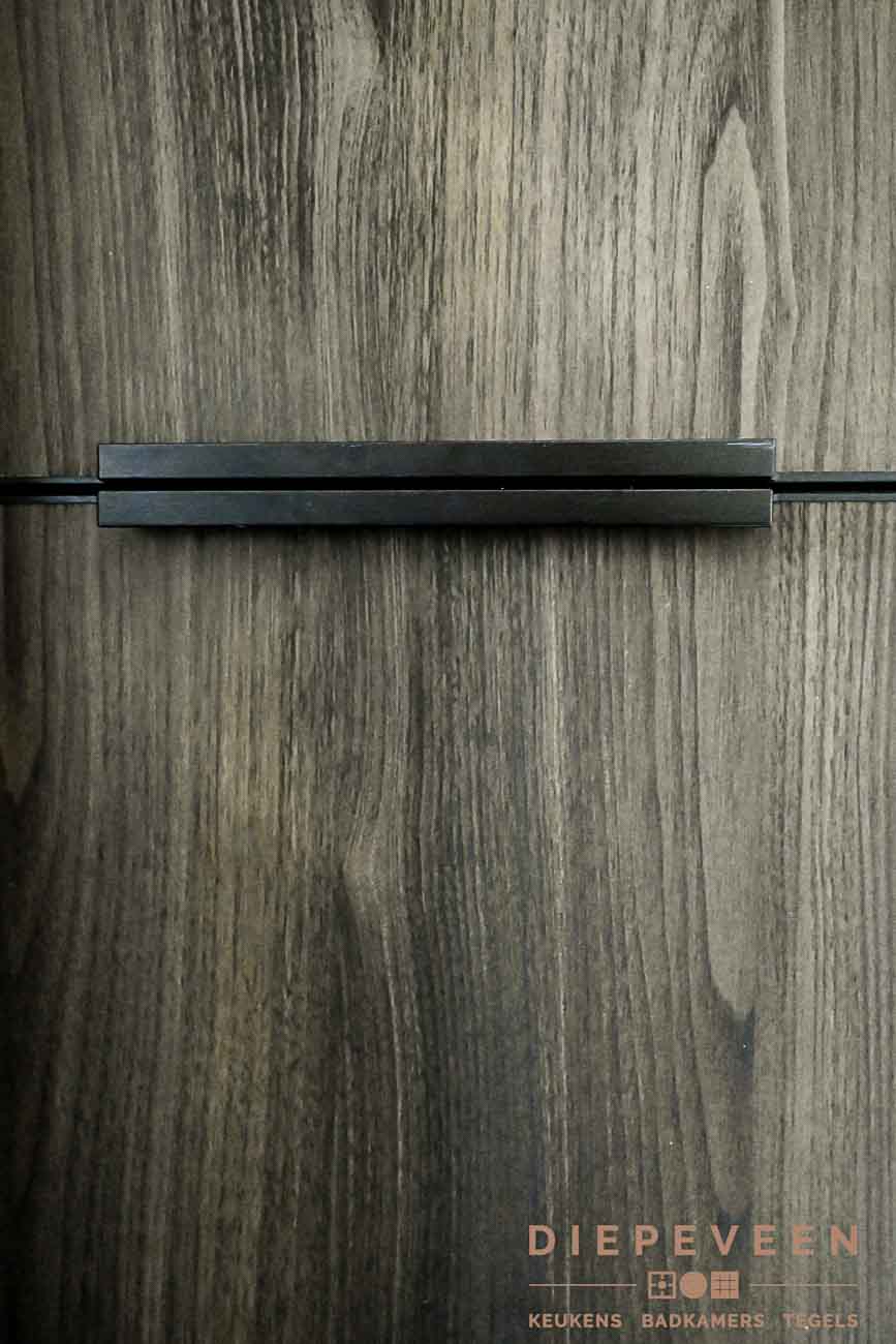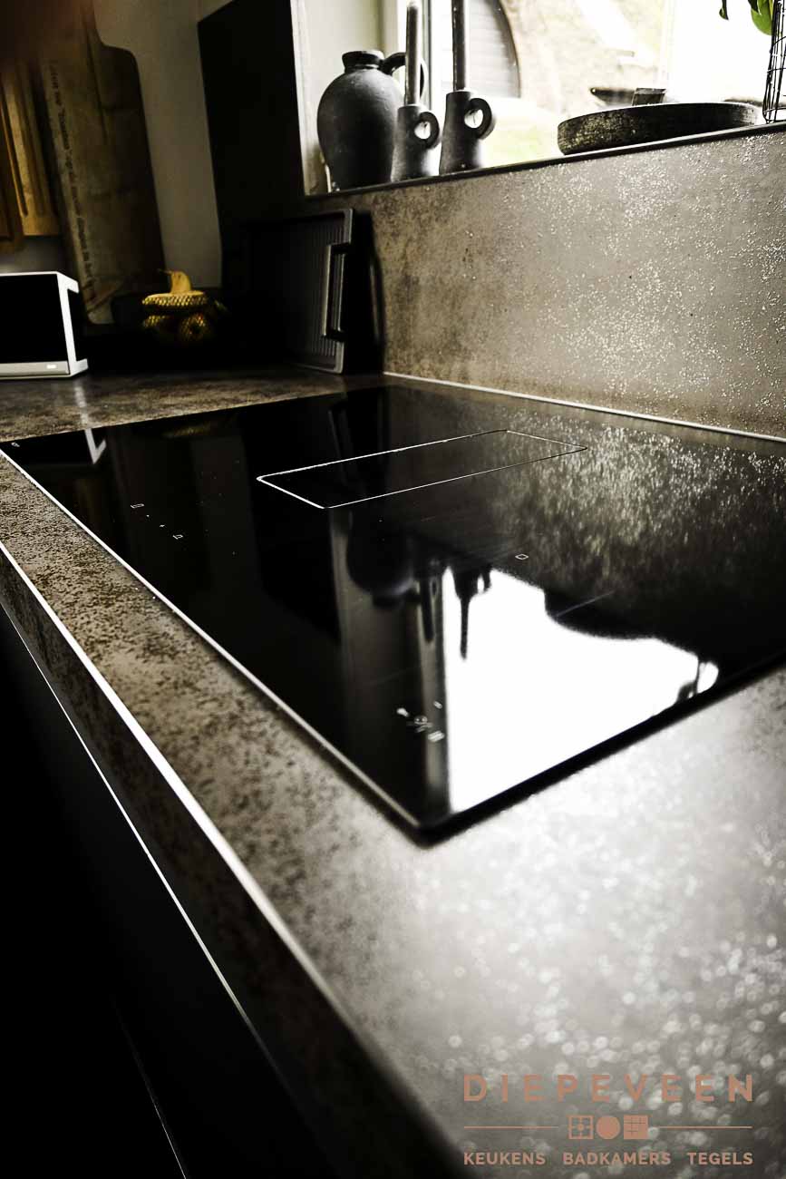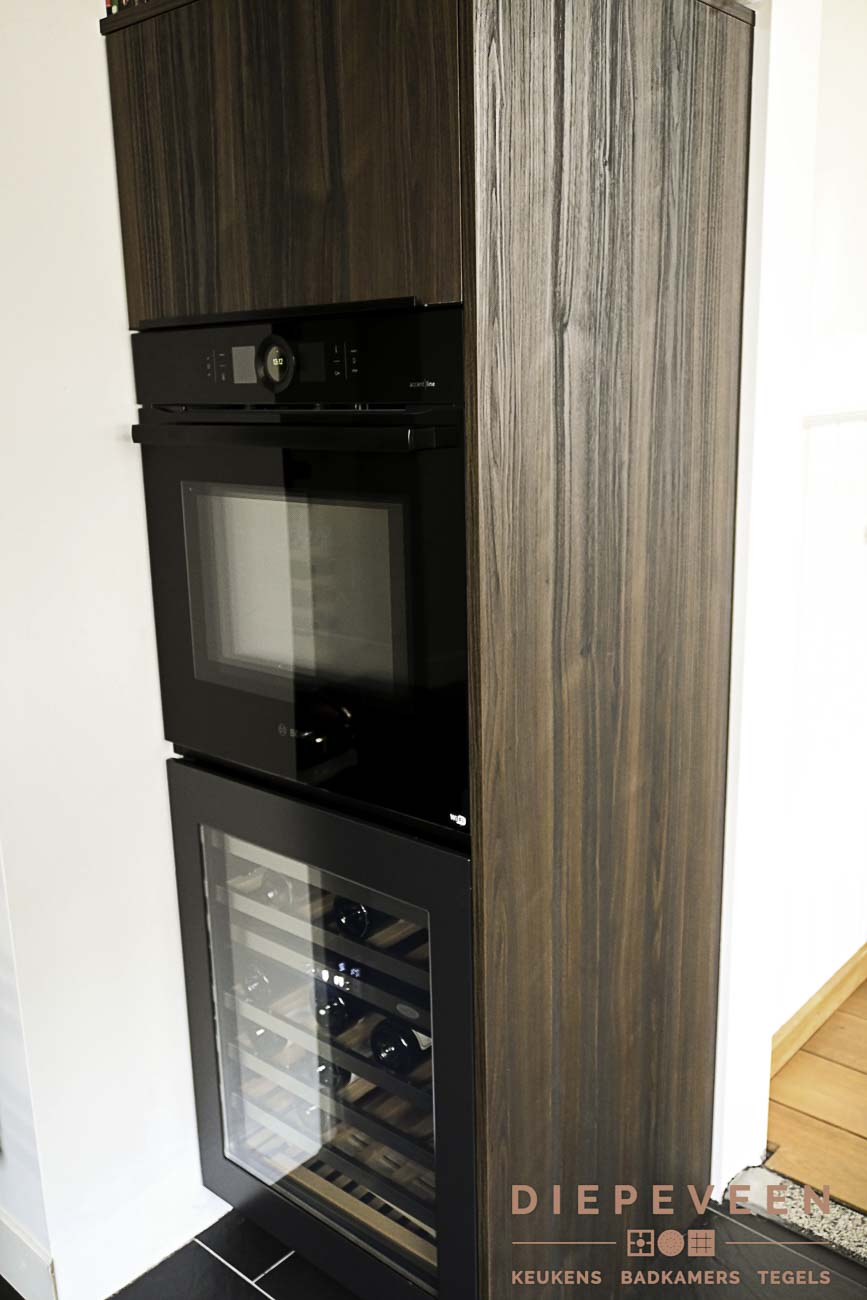 Zwarte tijdloze keuken met een keramiek werkblad. De keuken is greeploos en heeft een inbouwwijnklimaatkast.