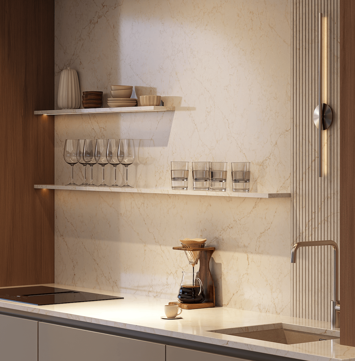 In deze opstelling staat walnoot karamel centraal. Het marmerlook werkblad en de half ingebouwde kasten geven de keuken een luxe uitstraling. Het contrast met greige melamine in de kleur sesam zorgt voor een kalm en stijlvol geheel. De greeploze uitvoering met verfijnde lijnen maakt het ontwerp strak maar toch warm.