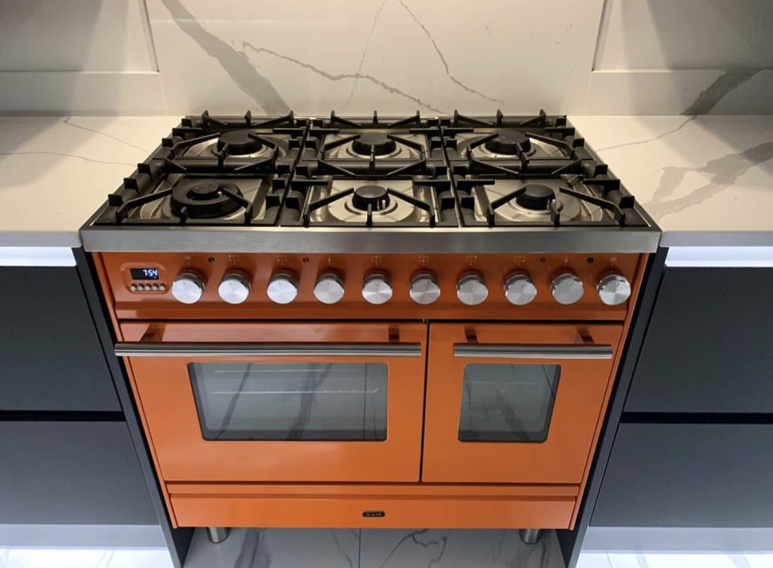 Orange is the new black! ILVE Professional Plus 90, 2 ovens, 6 branders & Frytop. Meer weten over dit project of bent u enthousiast geworden om zelf uw droomfornuis te ontwerpen? Neem gerust contact met ons op of bezoek onze showroom (op afspraak).
