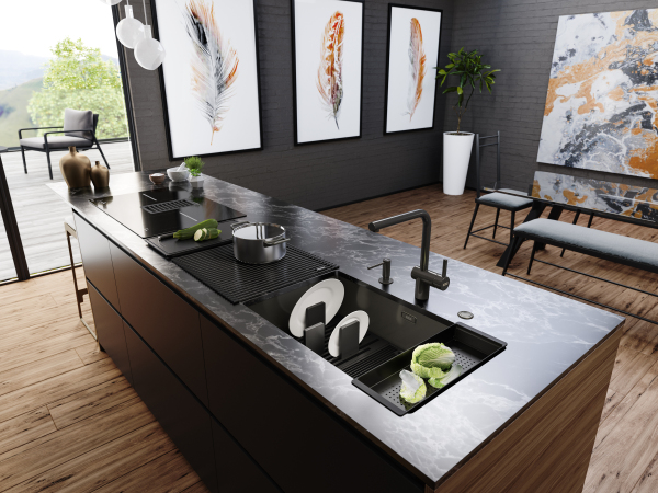 Sommige producten zijn ontworpen om iconisch te zijn. Dat is het geval met Kubus 2, de Franke-spoelbak van Fragranite in de kleur Black Matte, die de perfecte metgezel is om de ideale workflow in de keuken te realiseren. De spoelbak is groter, waardoor het de perfecte ruimte biedt voor het afspoelen van borden en grotere voorwerpen; bovendien maakt de geïntegreerde plank voor accessoires het gemakkelijker om ze te gebruiken, waardoor het werk in de keuken soepeler en sneller verloopt.