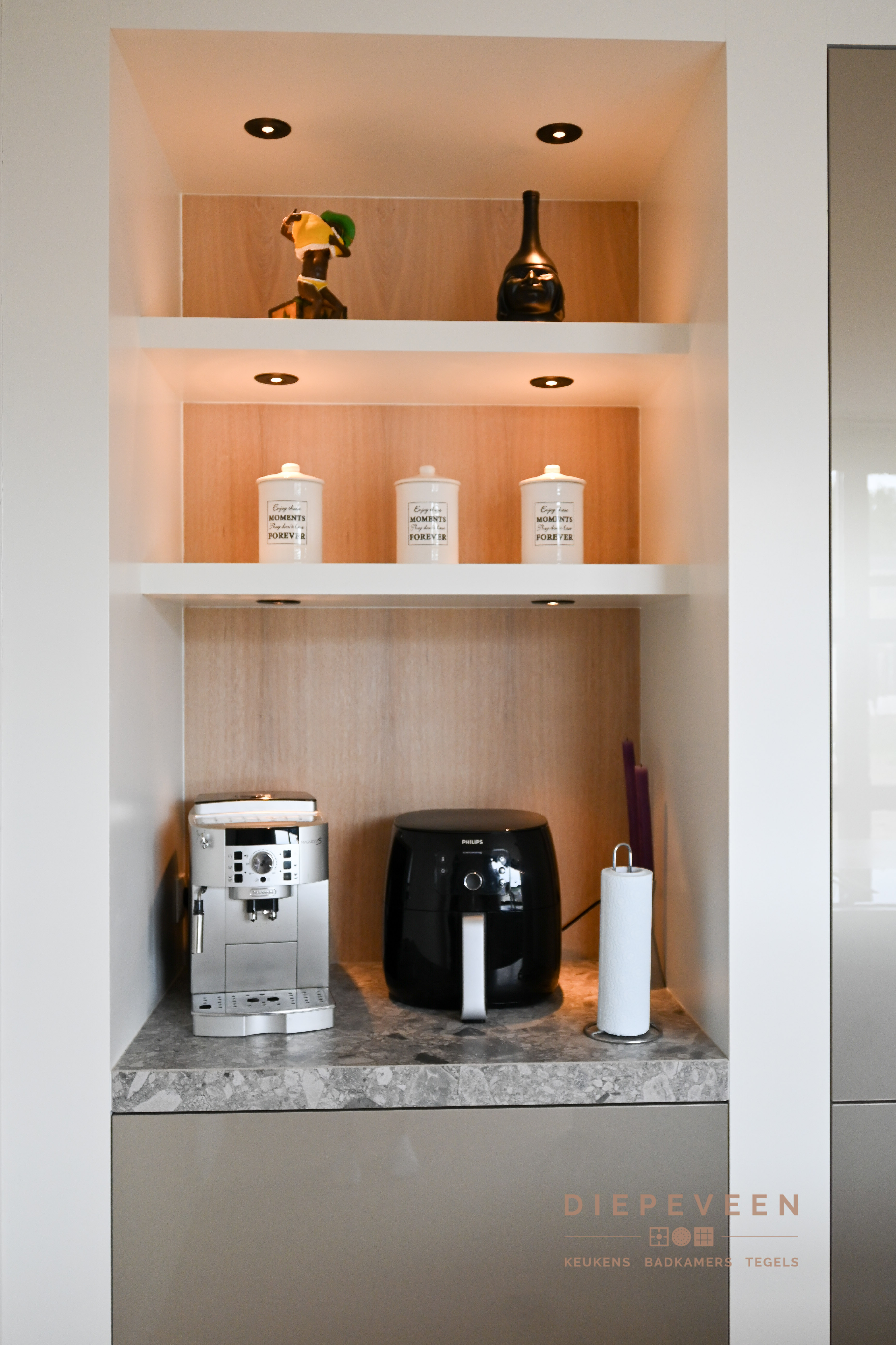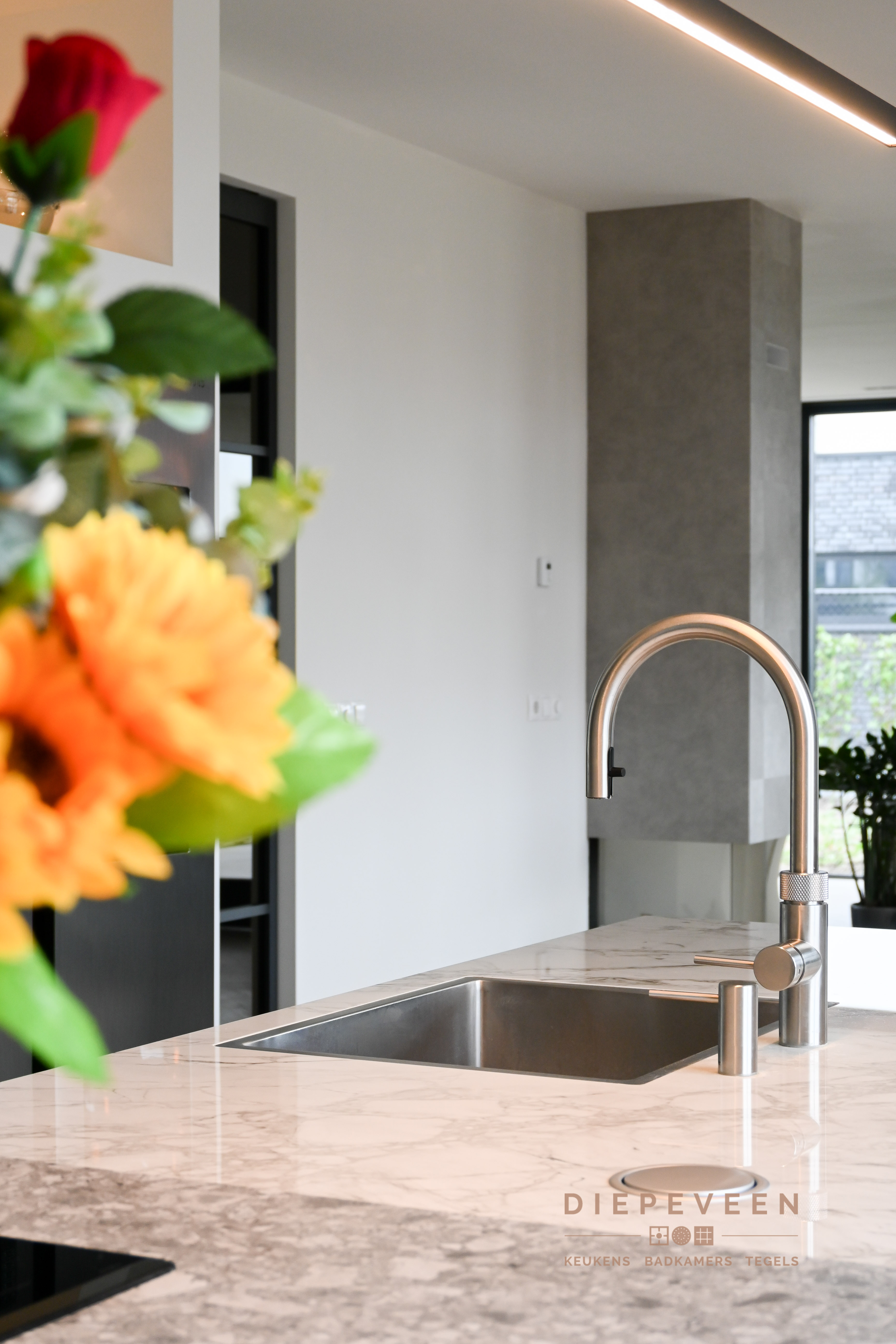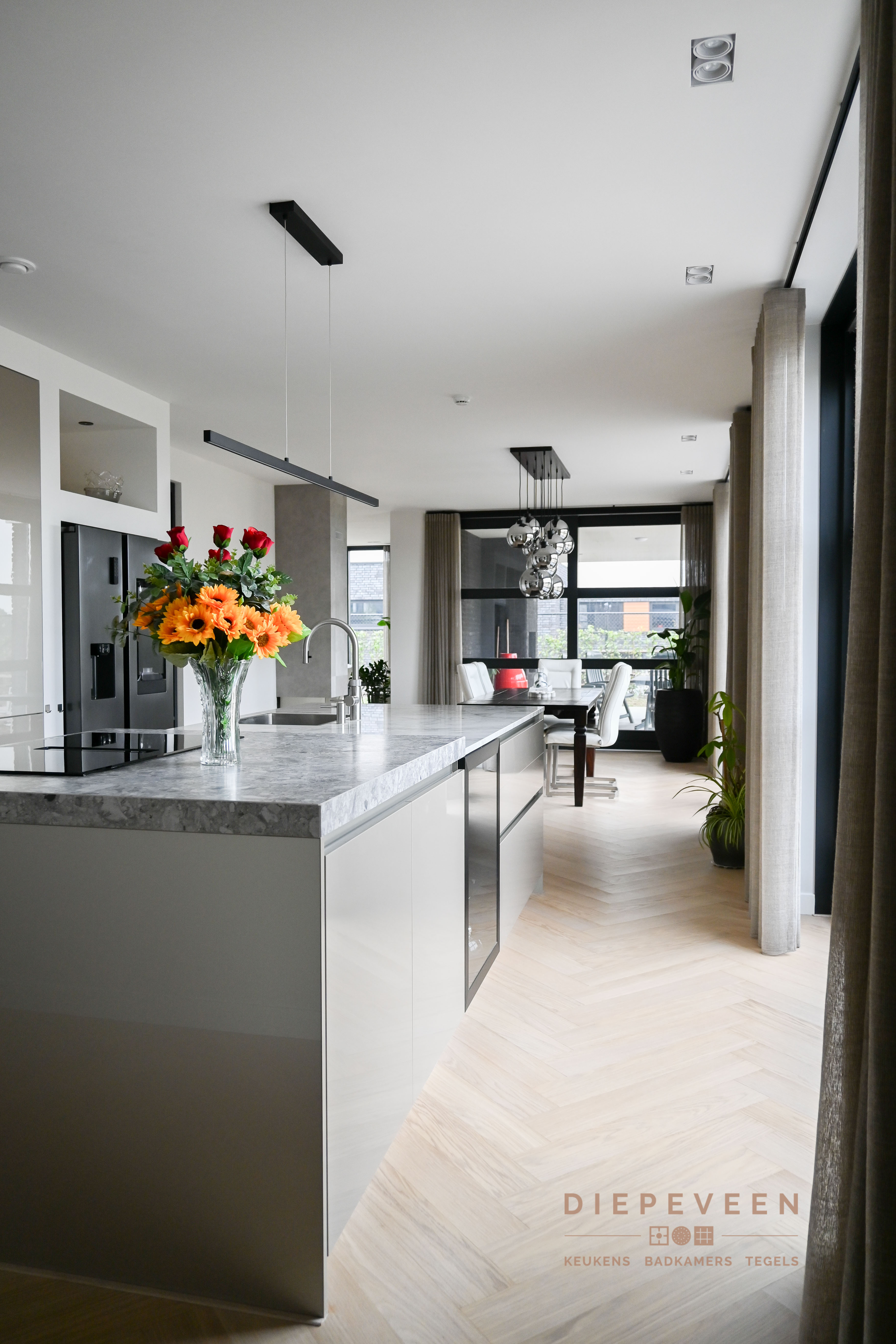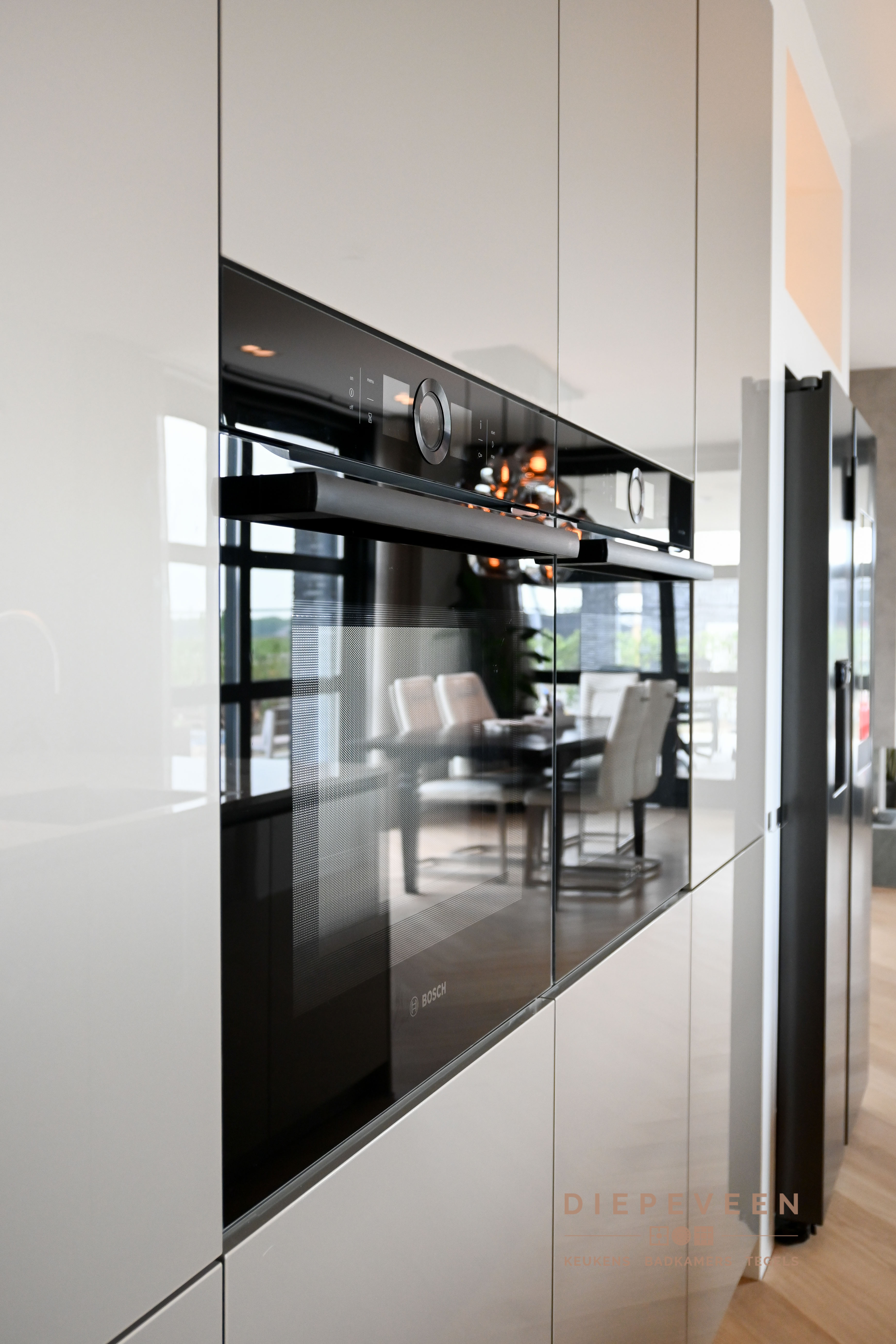 Deze hoogglans keuken bestaat uit prachtige details! Op het eiland vindt je twee verschillende werkbladen. Het keramieken werkblad is hoger geplaatst als het dekton werkblad wat een uniek en speels effect creëert. Verder is de keuken van alle benodigdheden voorzien. De spotjes in de nis zorgen voor een warme uitstraling in de keuken!