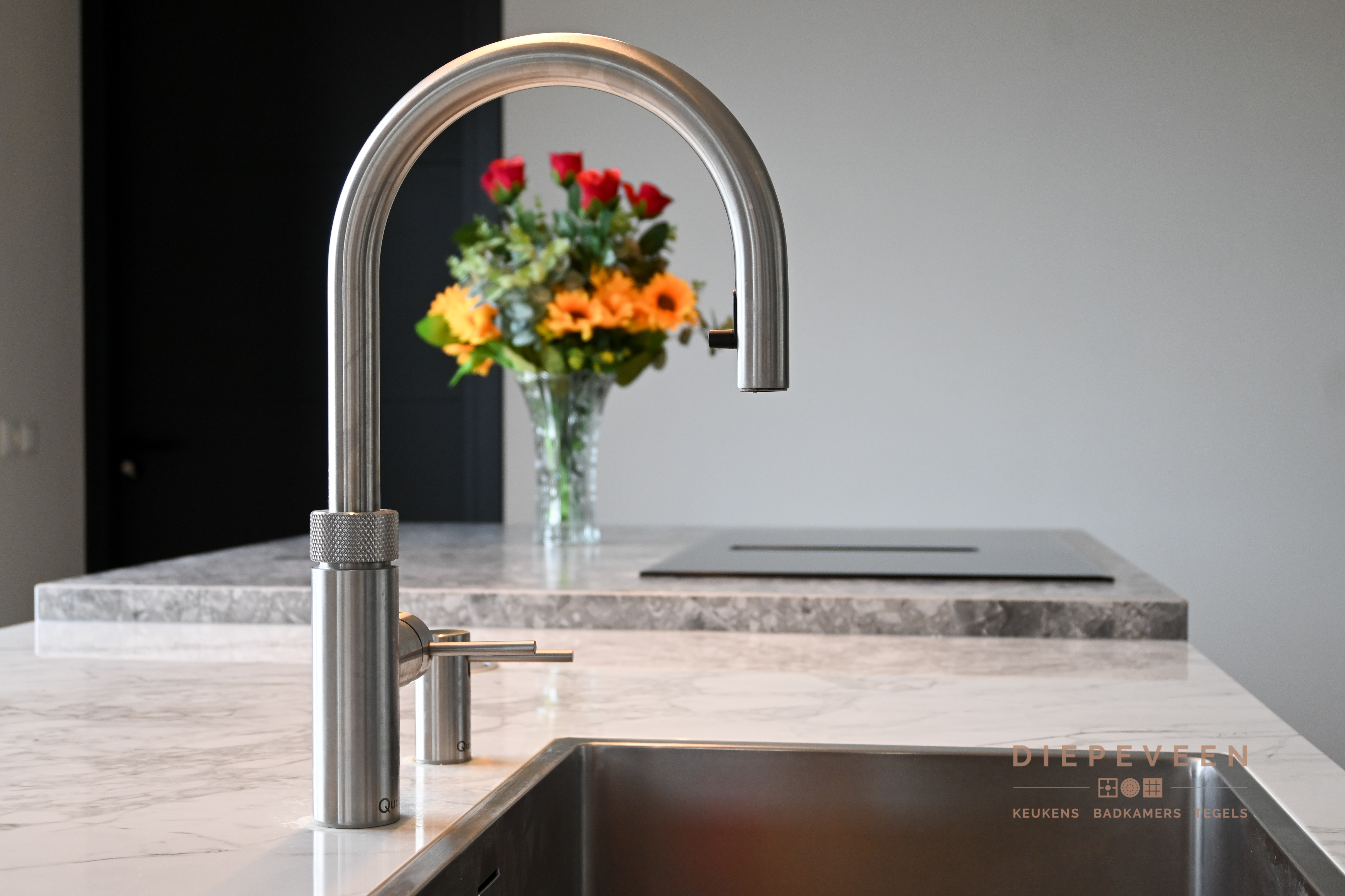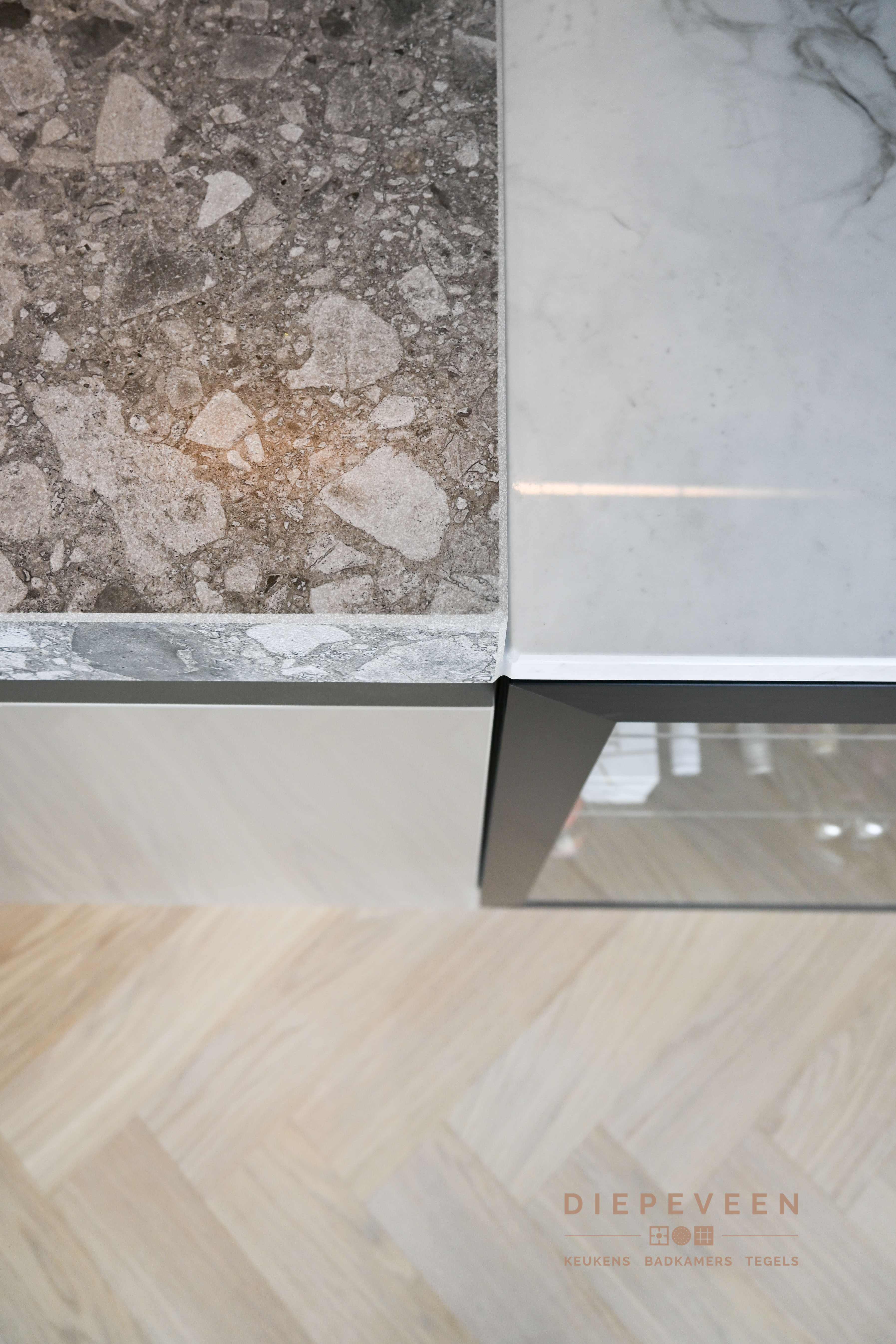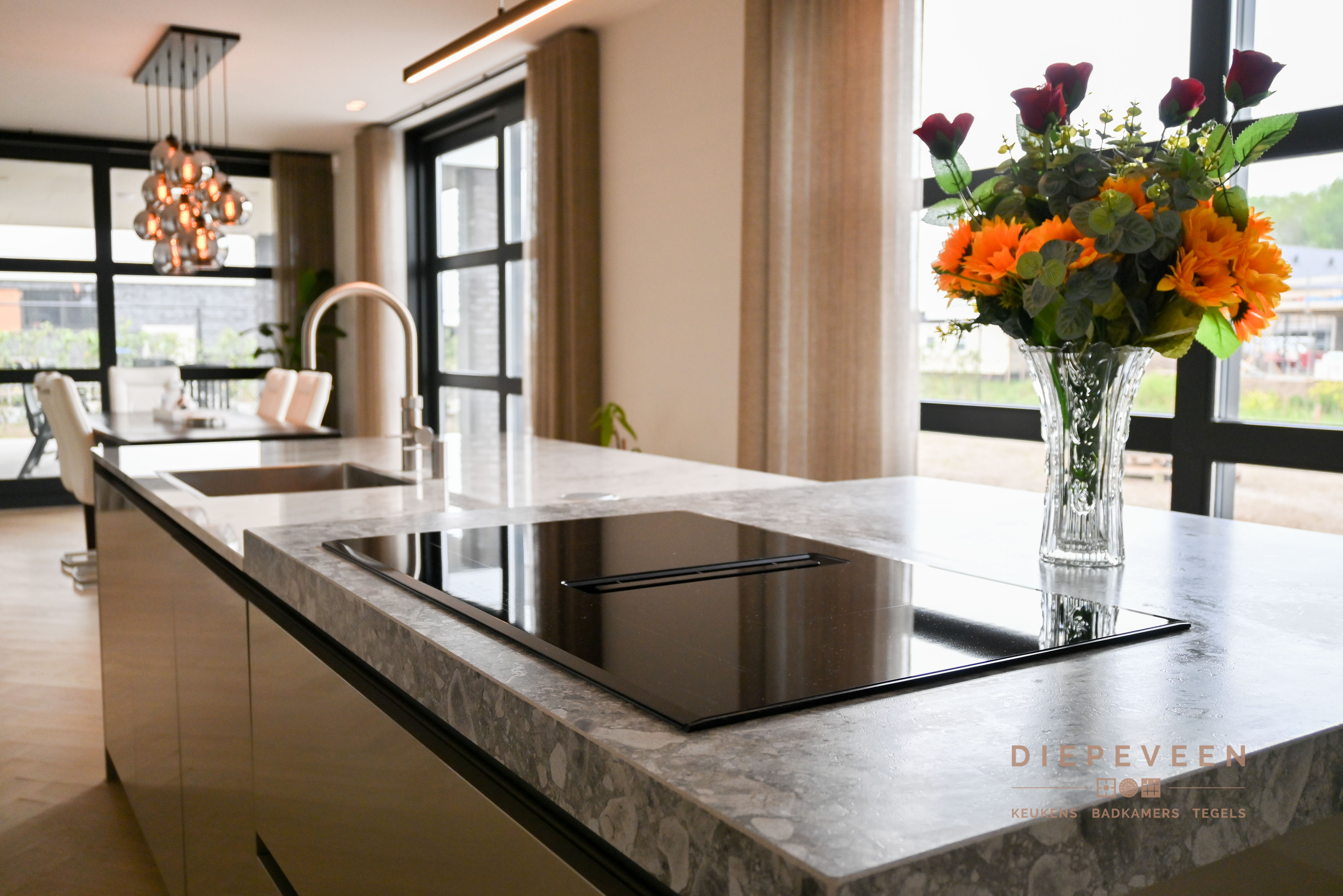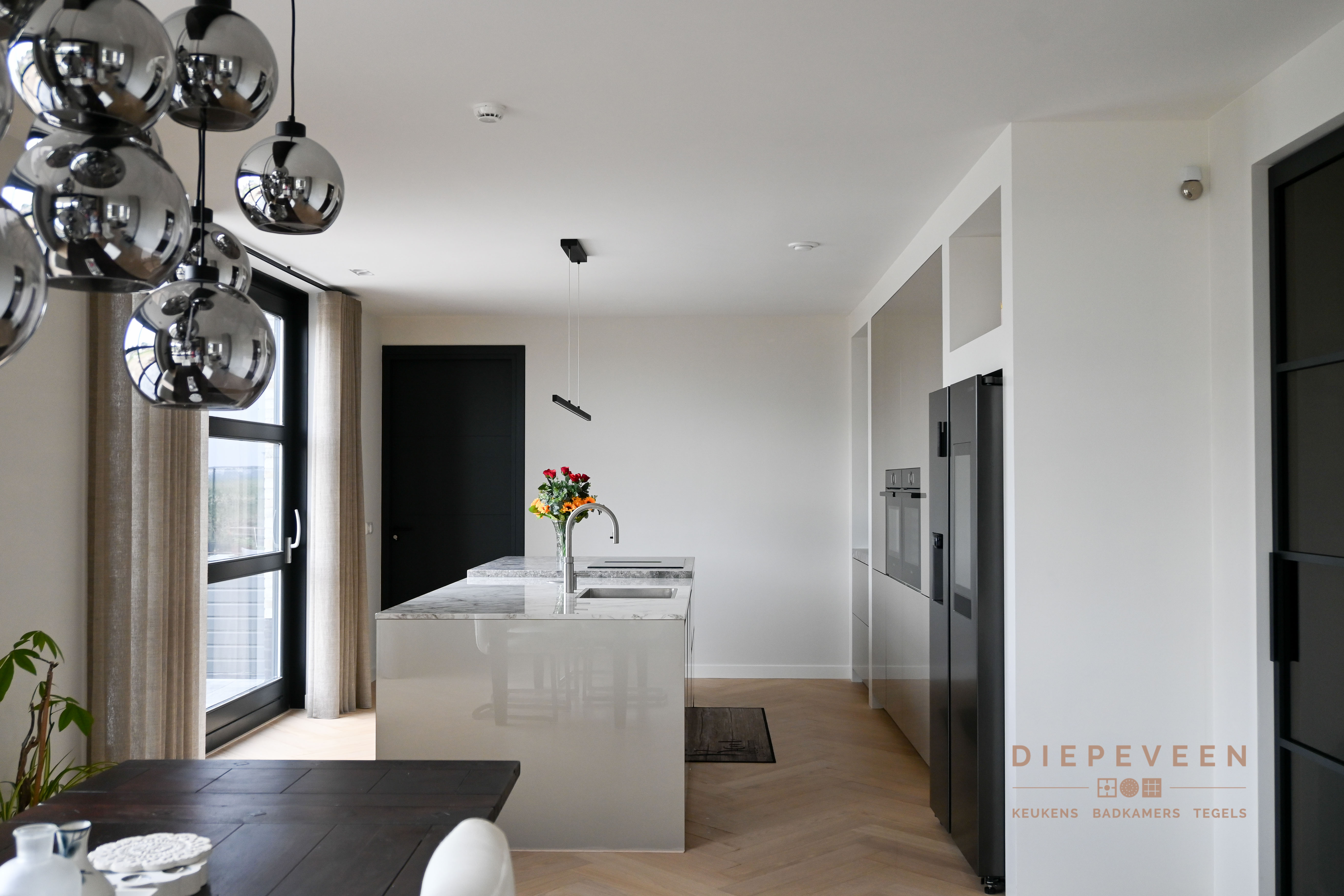 Deze hoogglans keuken bestaat uit prachtige details! Op het eiland vindt je twee verschillende werkbladen. Het keramieken werkblad is hoger geplaatst als het dekton werkblad wat een uniek en speels effect creëert. Verder is de keuken van alle benodigdheden voorzien. De spotjes in de nis zorgen voor een warme uitstraling in de keuken!