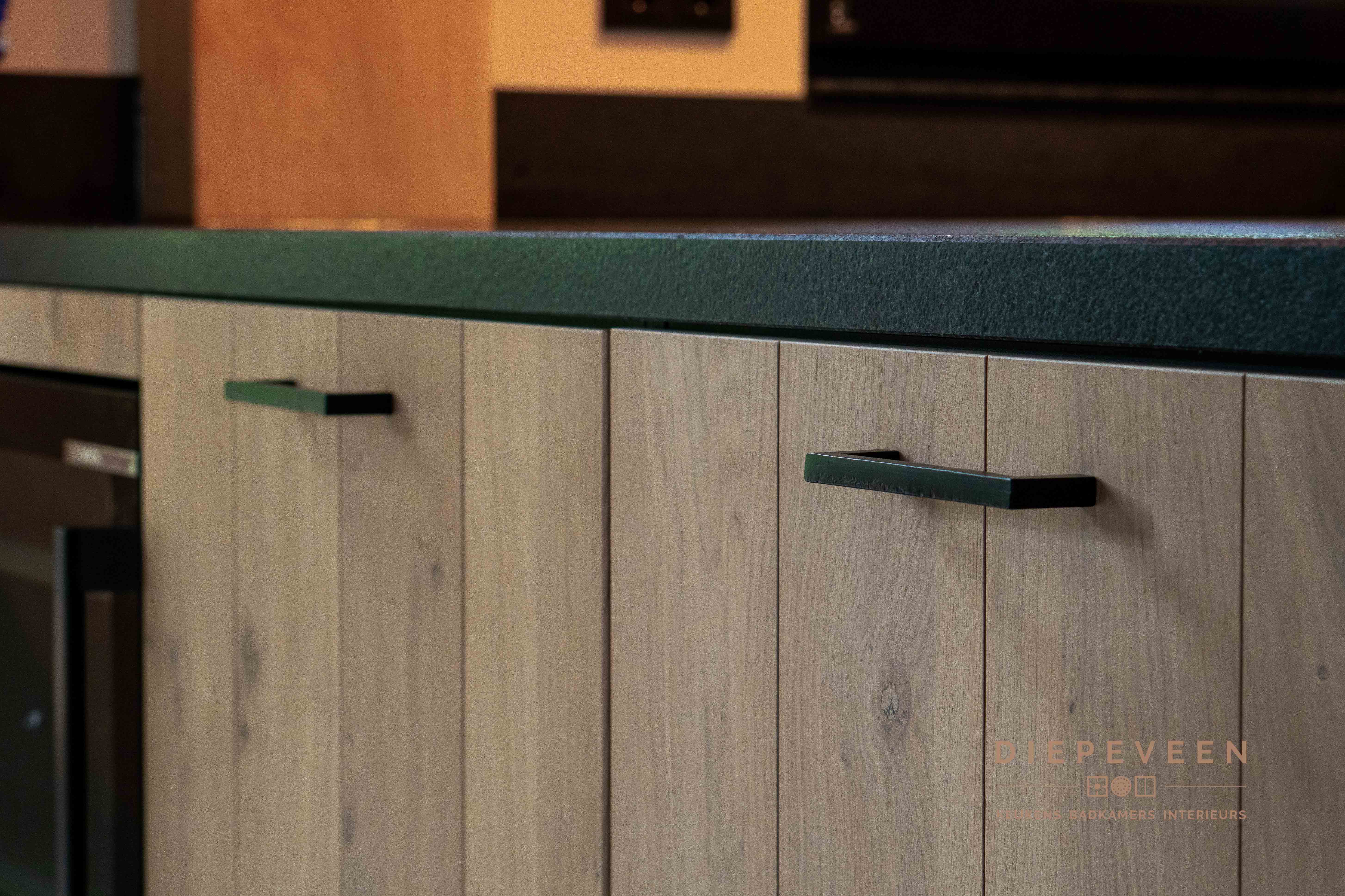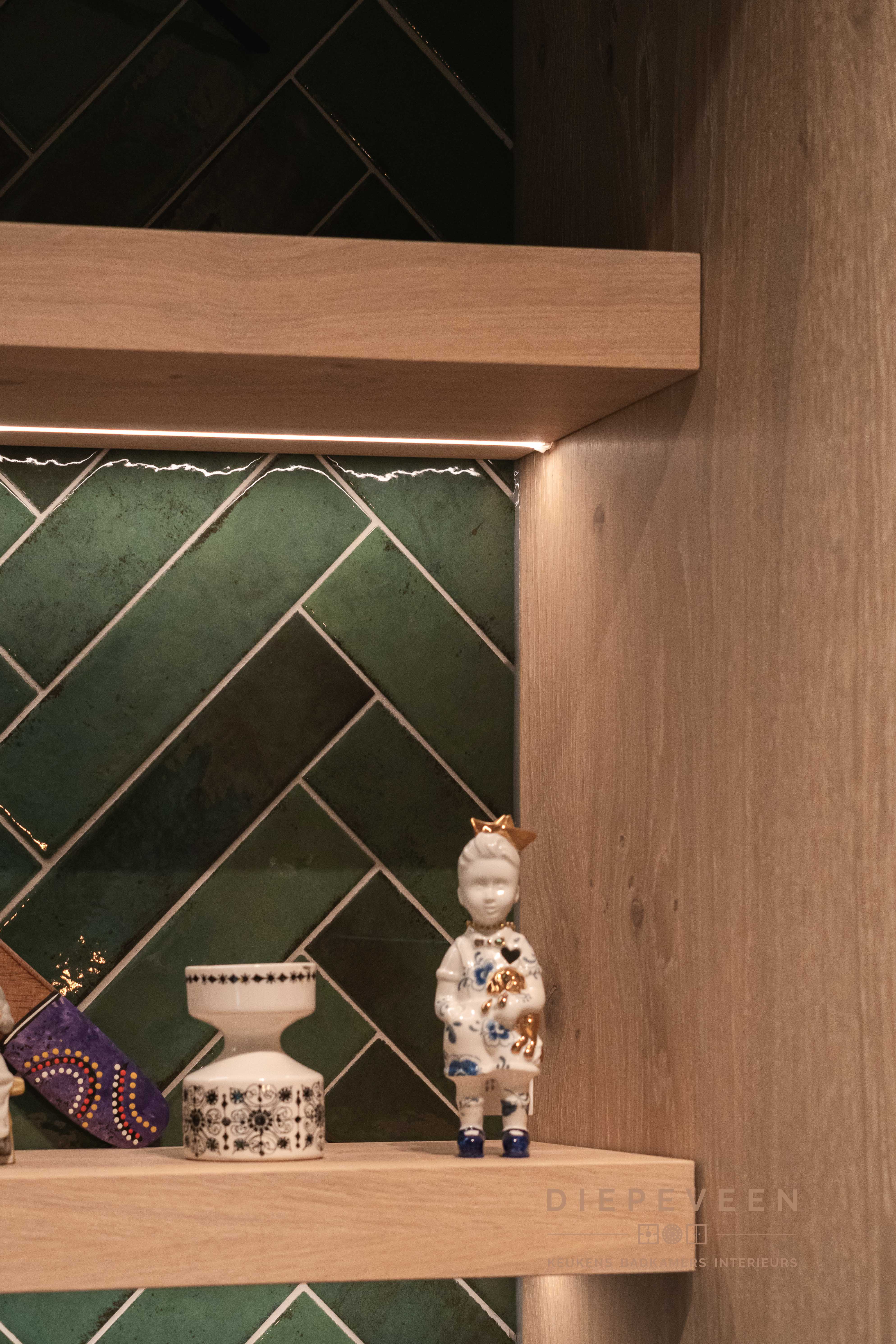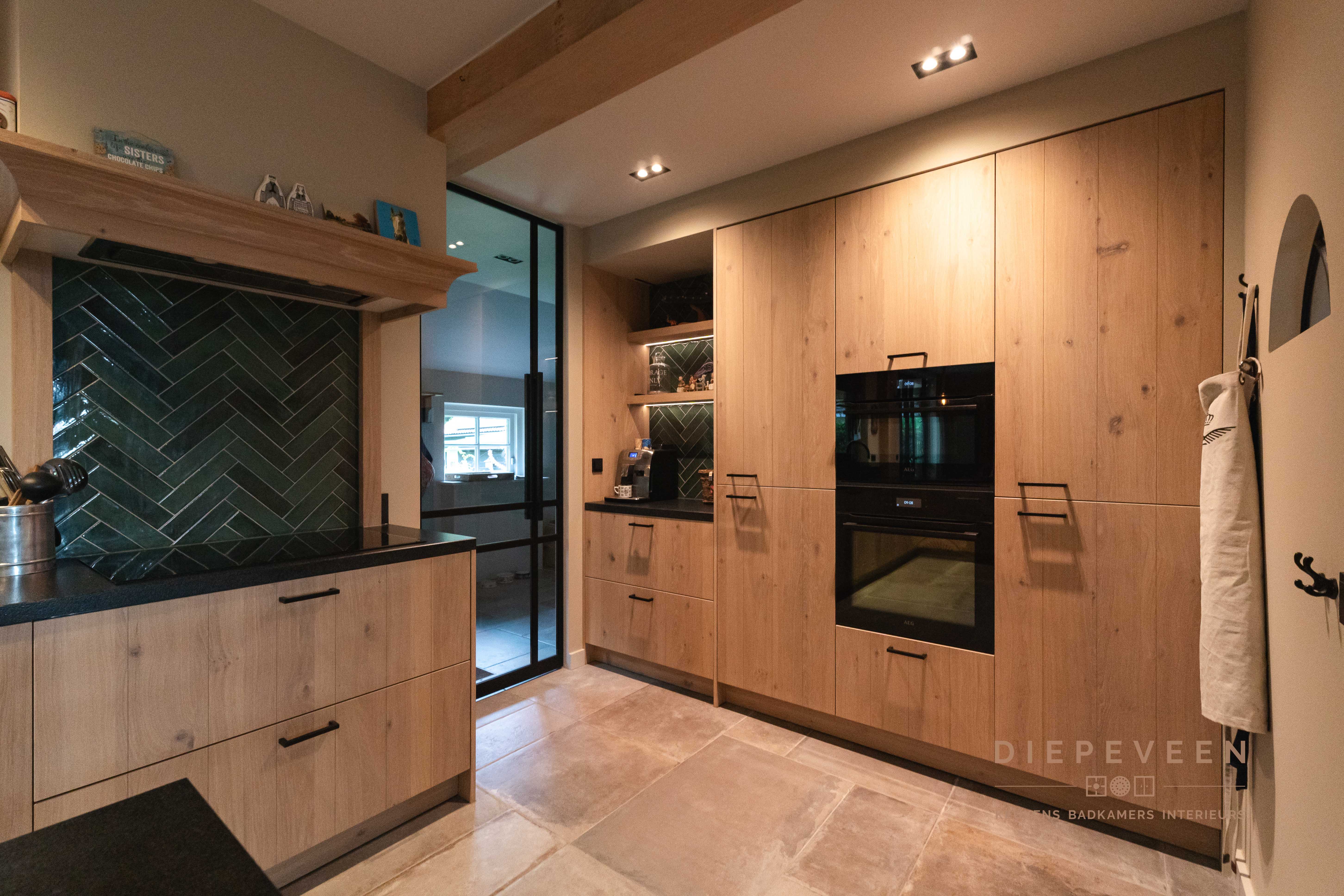 || HOUTEN LEEFKEUKEN || Wat een ruimte en sfeer in deze keuken! Heerlijk van alle gemakken voorzien, een praktisch ruim schiereiland en alle apparatuur is aanwezig. En we zien het niet iedere dag maar wat is het toch prachtig in deze keuken: de achterwand en nis getegeld in visgraat. De prachtige groene kleur is een ware eyecatcher! Een heerlijke ruime woonkeuken, een prachtig eindresultaat.