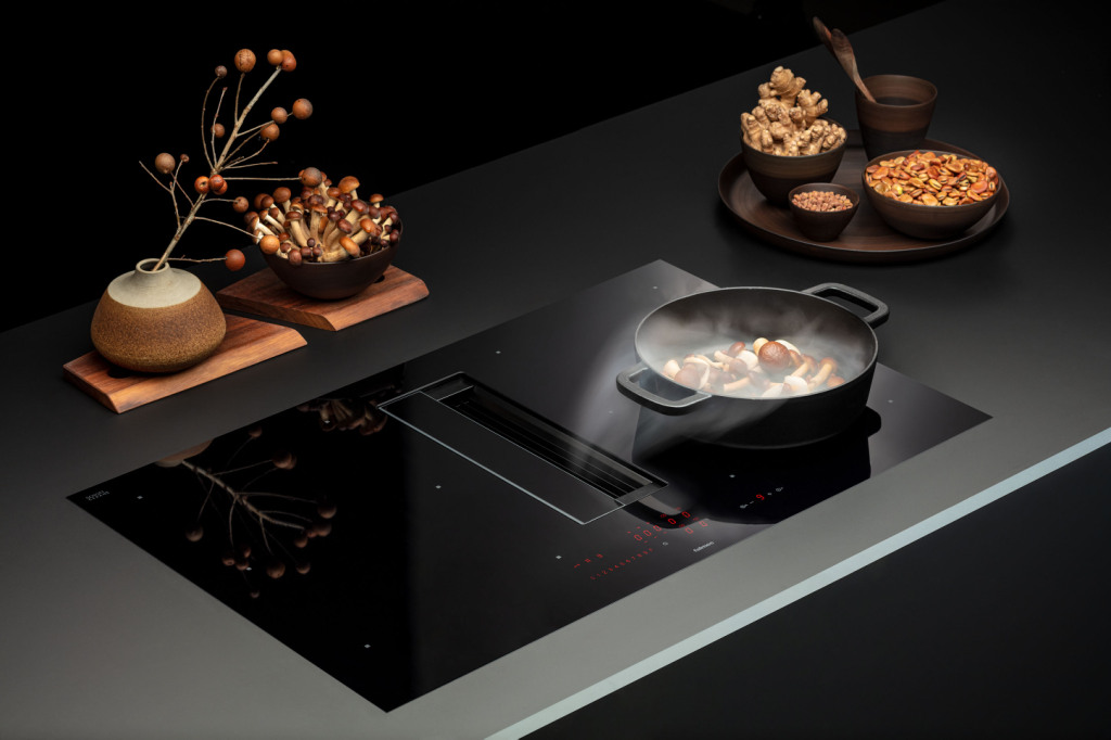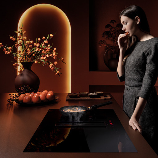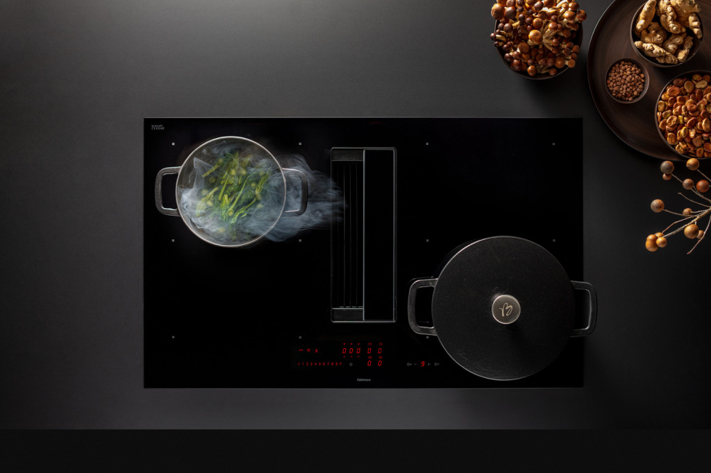 Met zijn elegante vormgeving valt de inductiekookplaat met afzuiging Zero van Falmec op vanwege het strakke en platte ontwerp.