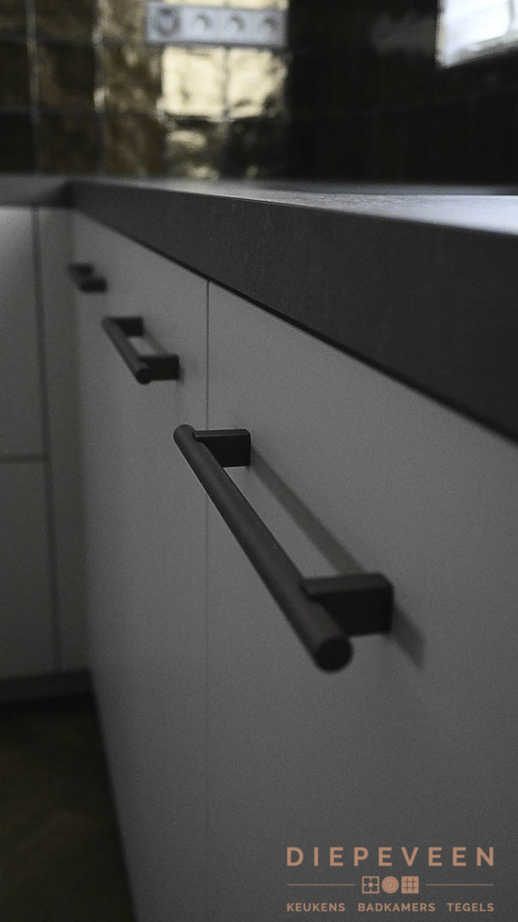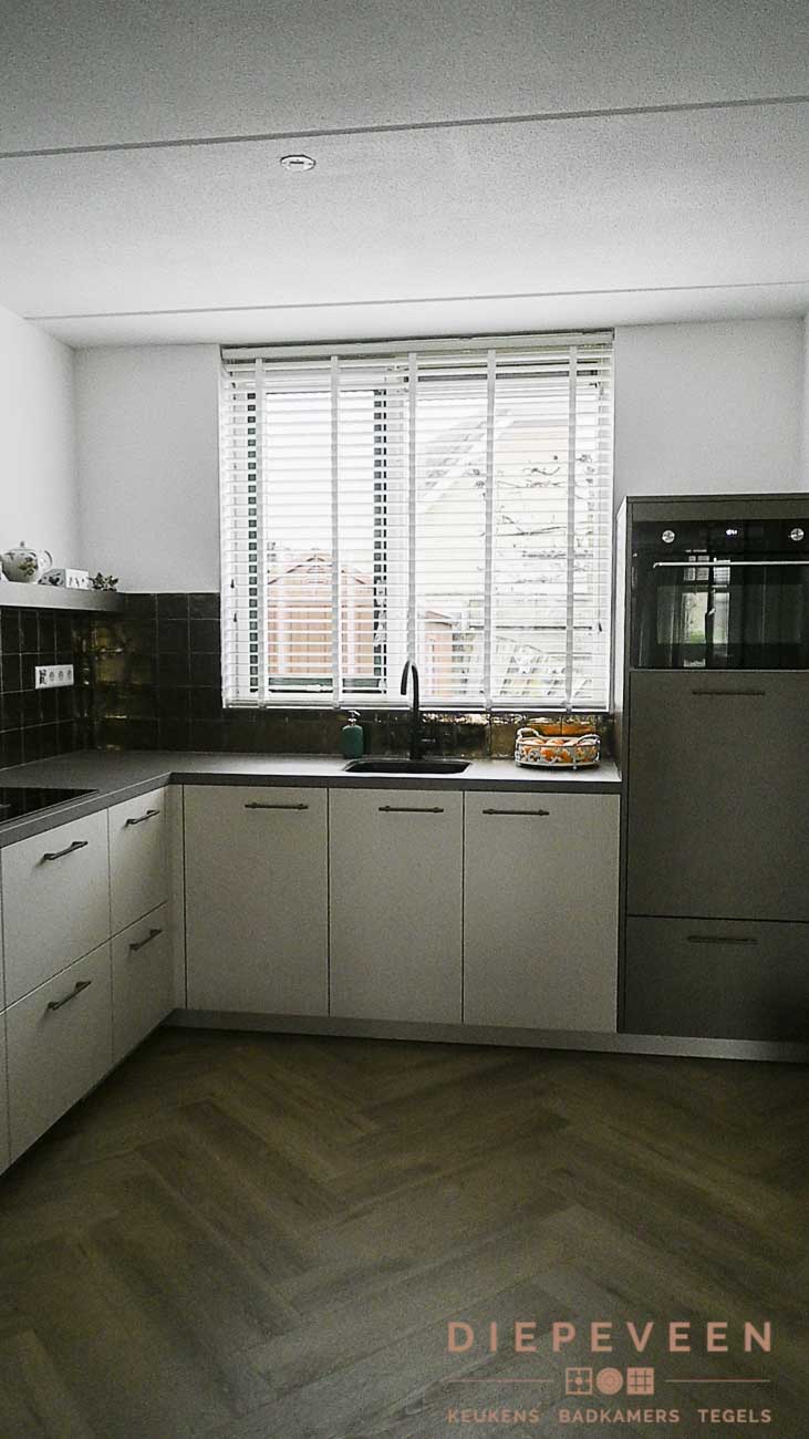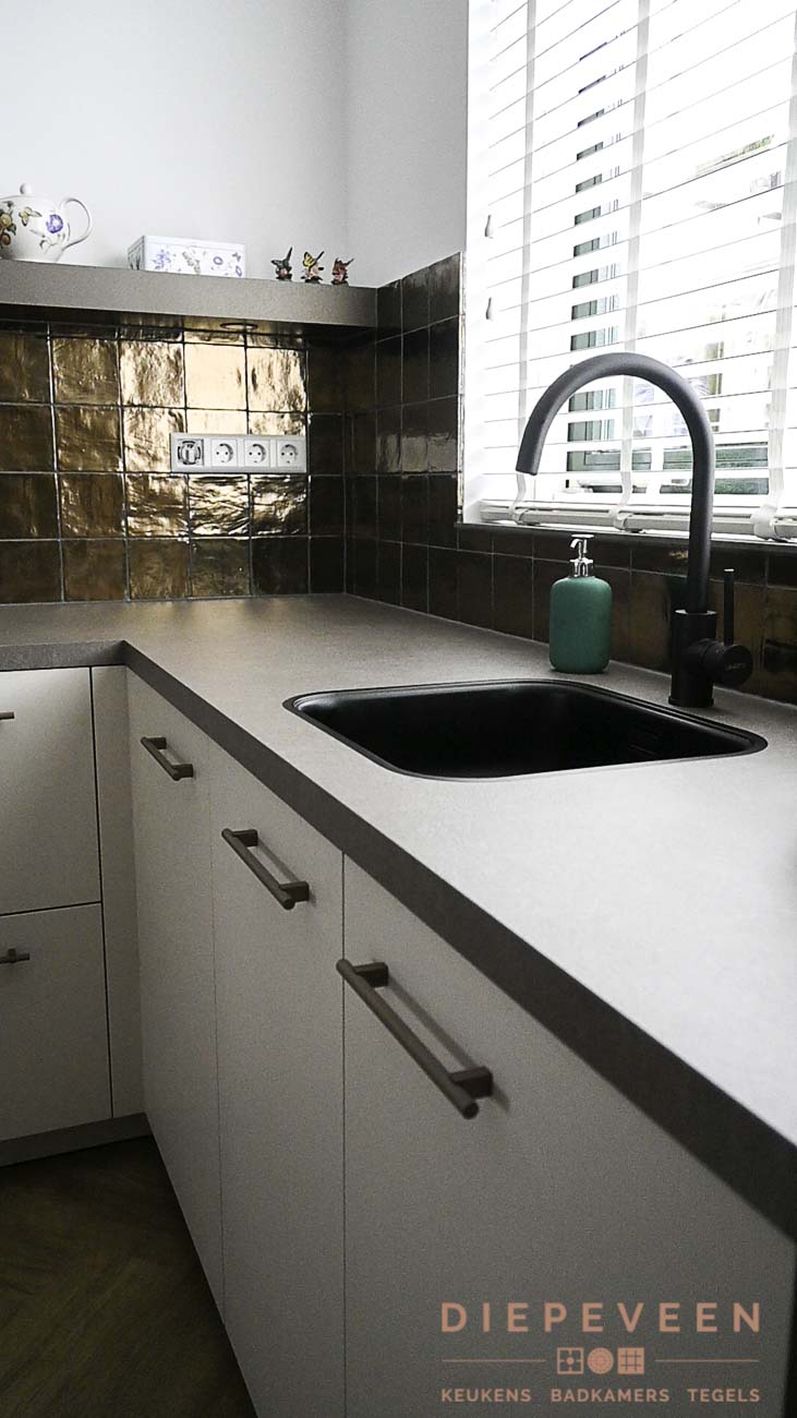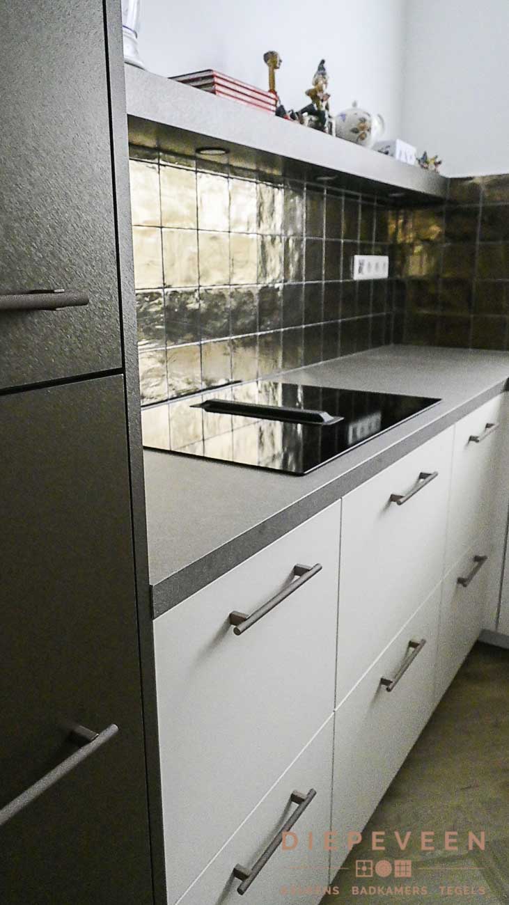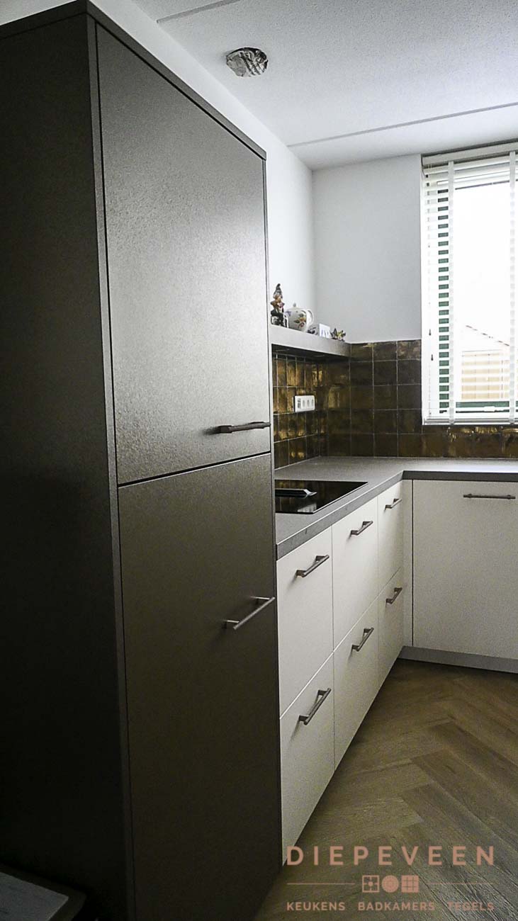 In deze keuken is er gebruik gemaakt van de ideale inductiekookplaat inclusief afzuiging. Ook beschikt de keuken over een multifunstionele oven met magnetron functie. Het raam boven de wasbak zorgt voor genoeg licht en laat de goudlook tegeltjes mooi afsteken tegen het grijze blad. De witte en bronze fronten geven de keuken een industriële uistraling!