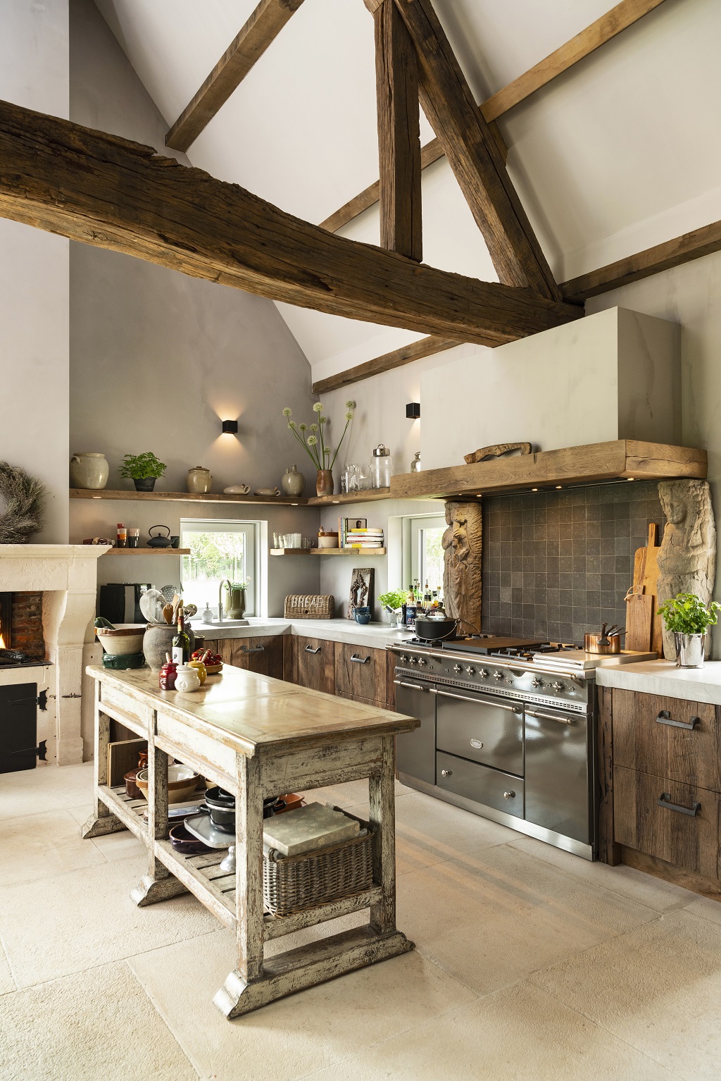 Sfeervolle landelijke keuken met industrieel tintje door blauwstaal en eikenhout.