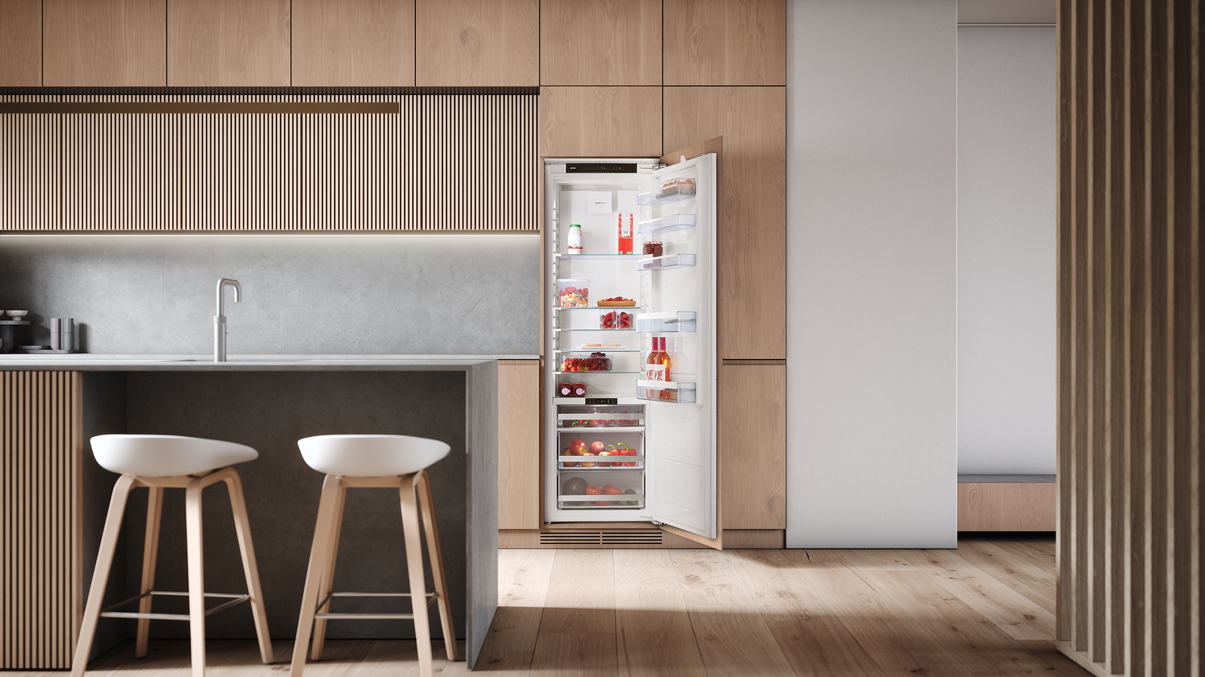 Moderne Mereno Milano keuken met kookeiland. De hoge kastenwand is gemaakt van noten fineer en het kookeiland is van Neolith Layla Slate. Daarnaast is er een tweede kastenwand gemaakt in een nis waar een koffiehoek gemaakt is.