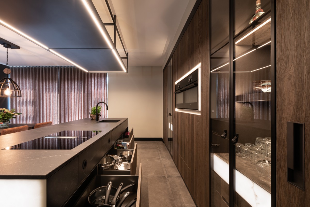 In de lange achterwand is een prachtige kast met glazen deuren gerealiseerd. In de schappen is verlichting geïntegreerd wat deze kast de ideale plek maakt om je mooie servies of andere pronkstukken tentoon te stellen.