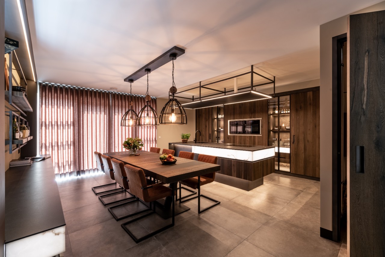 In deze prachtige warme leefkeuken komen alle elementen samen! De keuken bestaat uit een grote kastenwand met aan de ene kant mooie, glazen kastdeuren en helemaal links een ingebouwde deur naar de berging. Aan de andere kant zijn grote lades verwerkt welke zorgen voor meer opbergruimte. In het midden van de keuken staat de grote eettafel met hetzelfde houtfineer en een groot kookeiland waar veel werkplek is gegenereerd. Een bijzonder detail van deze keuken zijn de marbellight lichtboxen, deze zorgen voor een luxe sfeer en zijn een ware eyecatcher.