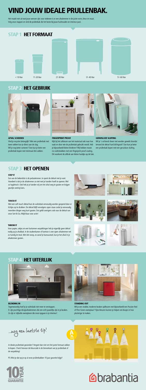 Brabantia toont dat afvalemmers geen noodzakelijk kwaad meer zijn, juist in tegendeel: ze zijn mooi, plezierig en duurzaam en vormen een stijlvolle toevoeging aan je interieur. Maar hoe kies je nou de prullenbakken die het beste bij jou past? Brabantia helpt je met een stappenplan.