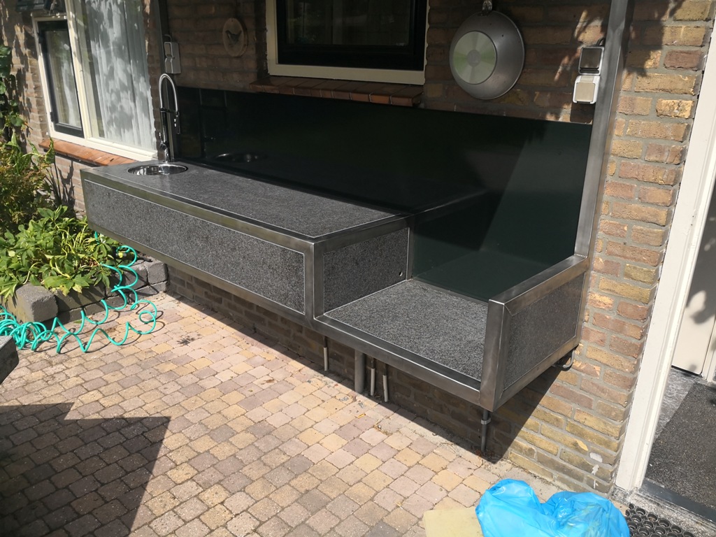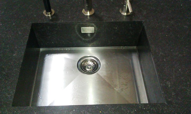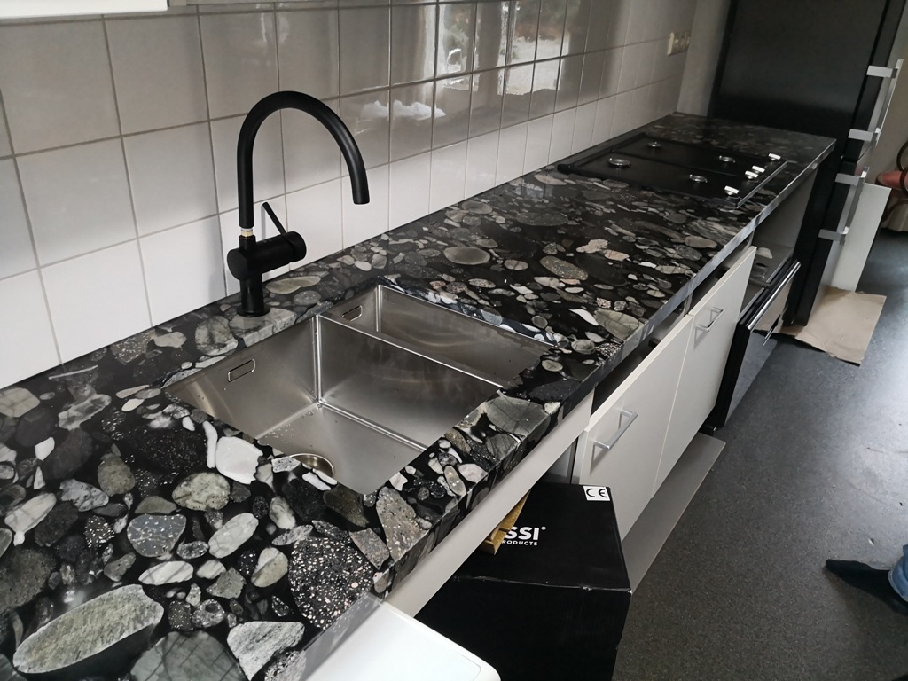Naast RVS spoelbakken kan uw werkblad ook gecompleteerd worden met onze Stone en Steel spoelbakken, een volledige RVS spoelbak (zodat er nooit lekkage kan komen) waarbij de wanden bekleed worden met de steen van het werkblad.