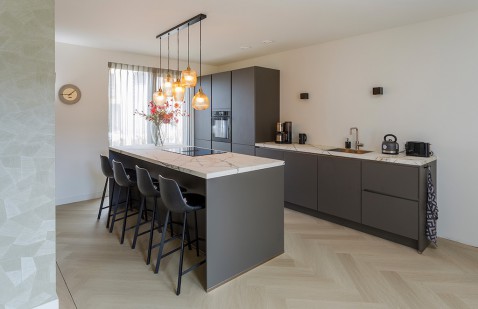 De keuken is strak greeploos waar ze blij mee zijn. “We vinden strakke keukens mooi en we zijn denk ik niet zo van de grepen. Ik zou echt niet geweten hebben welke handgreep ik zou hebben moeten kiezen.”