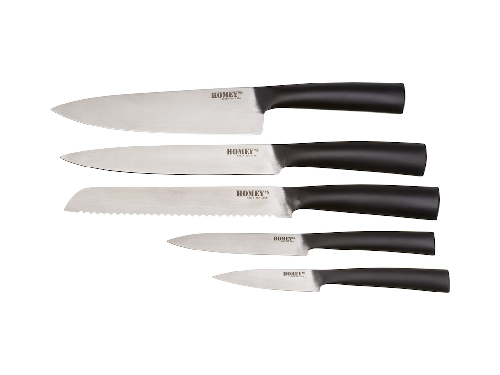 Het heft van Homey’s SVART is mat zwart en loopt naadloos over in het vlijmscherpe, stalen lemmet. Dit geeft het mes een stoer en edgy uiterlijk en hiermee positioneert Homey’s haar SVART serie voor de man die van koken houdt. De Homey’s SVART serie bestaat uit een koksmes, vleesmes, broodmes, tomatenmes en een officemes en hiermee heb je alle musthaves in huis! Verkrijgbaar bij o.a. Bol.com en SharpAsAKnife.eu