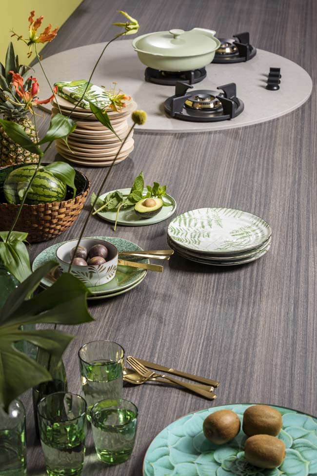 In totaal presenteert keukenbladenfabrikant Dekker in de collectie 2018 vijf nieuwe kleuren TopCore. Naast de al genoemde kleuren passen ook de Cryptic en de Nuts feilloos in de trend van ETHNIC NATURE, die geïnspireerd is op etnische culturen en de tropische natuur. In deze stijl zien we een mix van aardse kleuren en natuurlijke materialen, een prachtig bruinpalet en zwarte tinten in combinatie met grovere hout- en steenstructuren die zichtbare oneffenheden, nerven en aders vertonen.