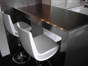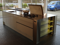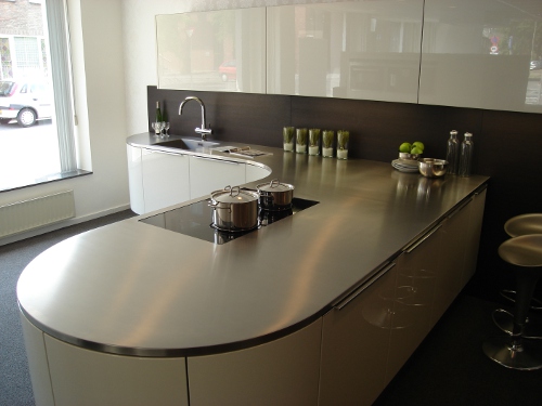 Rvs is erg praktisch; corrosiebestendig, duurzaam en hygiënisch. Rvs kan ook echter heel mooi zijn! Wat dacht u van een rvs keukenblad gecombineerd met volkern? Prachtig strak rvs blad voorzien van mooie rondingen. Het blad is 25 mm hoog en de afwerking is glad mat geborsteld.Tevens is het blad voorzien van een strak ingelaste spoelbak en een vlak ingebouwde inductiekookplaat. Alles wat Merito fabriceert is rvs maatwerk, zodoende kan alles naar de wensen van de klant worden vervaardigd. U kunt dus zelf kiezen wat voor spoelbak, kookplaat, afwerking/finish, randhoogte, afmeting e.d. u wilt hebben.