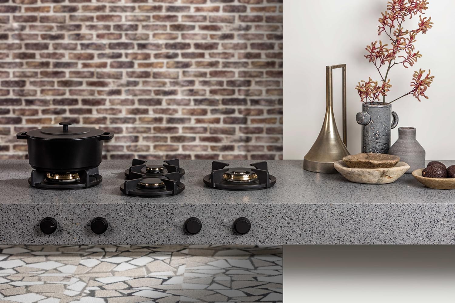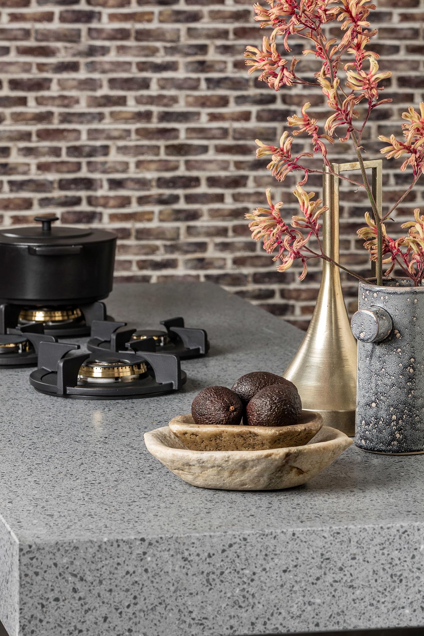 Terrazzo! Maar dan net even anders dan we gewend zijn, want er is meer variatie in kleur en structuur. Jammer dat terrazzo wat meer onderhoud nodig heeft … De oplossing? Een lookalike van composietsteen. Dat hoeft niet meer geïmpregneerd te worden en is ook bestand tegen zuren.