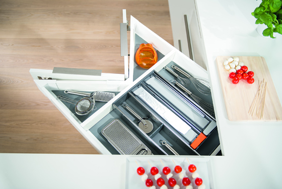 Die hoekkast in de keuken is een doorn in het oog van elke keukenprins(es). Je kunt er niets mee. Kiezen is altijd verliezen. Je verliest te veel ruimte of je kunt moeilijk het overzicht bewaren. Blum biedt met de SPACE CORNER de ideale oplossing. Je behoudt het overzicht zonder al te veel in te boeten aan ruimte.