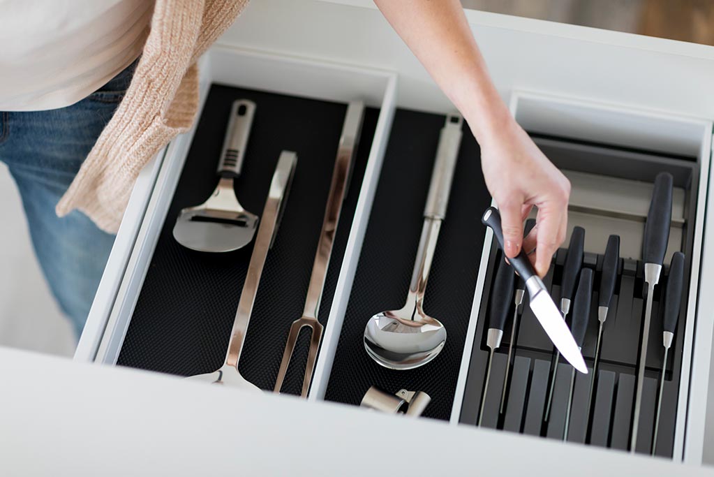 Dankzij de duidelijke lay-out hoef je nooit meer te zoeken naar de juiste tools! Bovendien zorgt het universele design ervoor dat ze altijd een mooi plaatsje krijgen in je lade, ongeacht waar je ze wil positioneren. Met de handige verdeelstukjes van de kaders voor groter werkbestek pas je in no-time de grootte van de vakken aan. Op die manier wordt de indeling volledig afgestemd op jouw keukengerei en krijgt alles zijn eigen plaatsje.