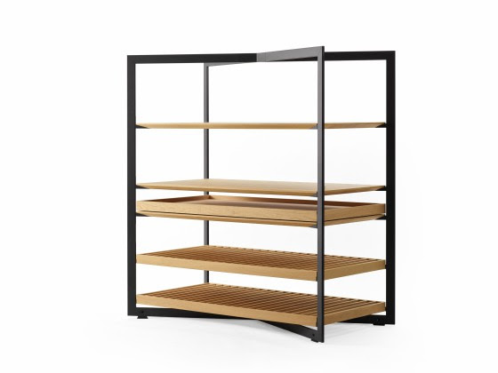 Dit frame staat mooi als centraal element in je keuken of leefruimte. Het 140 x 70 aluminium frame kan worden voorzien van een bovenblad van roestvrij staal of glas. Qua uitrusting kan je hier kiezen tussen houten roosters, legplanken en uittrekbladen (met of zonder glazen opzetelement). Ga ook hier voor één, twee of drie niveaus en positioneer ze hoe je zelf wilt.