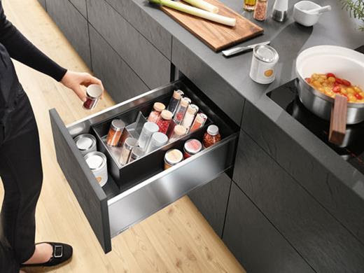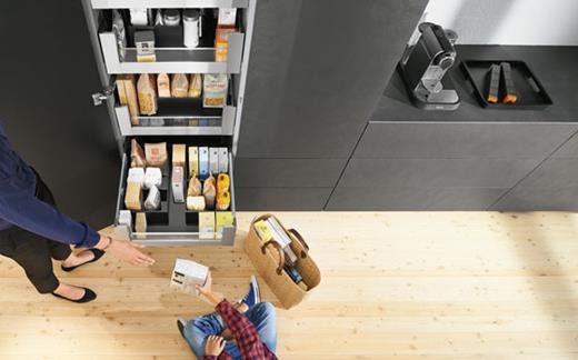 Het antwoord is de Space Tower van Blum. Van buiten ziet deze kast er net zo uit als een apothekerskast of lange opbergkast met plankjes, maar van binnen is het een ware opbergkampioen. Met de lades van Blum wordt aan de binnenkant elke nuttige centimeter benut. De deur is vastgezet met scharnieren die ín de kast geen ruimte innemen waardoor letterlijk de hele binnenruimte van de kast voor opbergen gebruikt kan worden. De lades kunnen volledig uitgetrokken worden waardoor ook dat blikje tomatensaus achterin niet vergeten wordt. Tests hebben het uitgewezen: in de Space Tower kun je 30 procent meer inhoud kwijt dan in een apothekerskast.