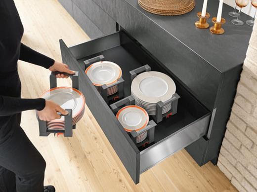 Voorkomen is beter dan genezen, geldt ook in dit geval. Blum heeft twee tips. Ten eerste: bewaar borden in een lade. Het is vele malen makkelijker om iets van lager omhoog te tillen dan boven je macht gewicht te moeten dragen. De tweede tip: gebruik een bordenhouder, want daarmee gaat het tillen van een stapel veel ergonomischer. Aan de handgrepen til je ze allemaal in een keer naar de tafel en zijn ze bovendien beschermd in de la. Stervormige borden speciaal voor het kerstdiner? Geen probleem, want de houder is aan te passen aan alle soorten borden.