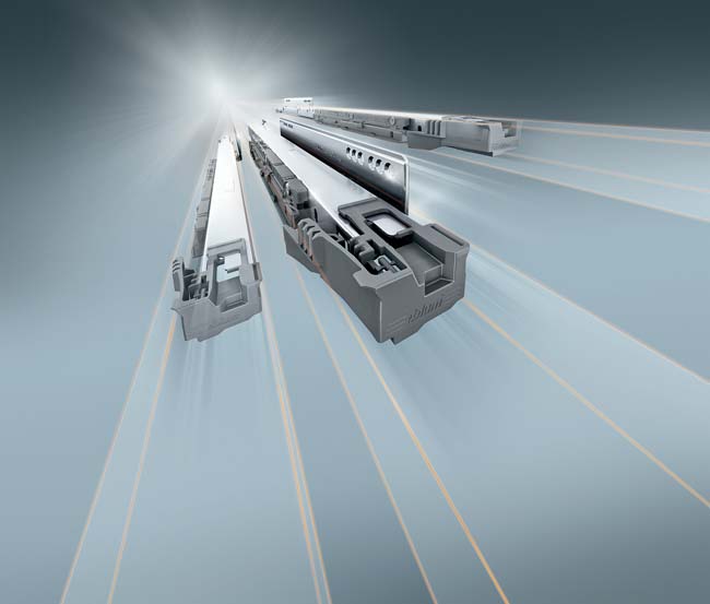Nieuw is de Blum-geleider waarmee het mogelijk is om drie van de gekende bewegingstechnologieën (BLUMOTION , Tip-On BLUMOTION en SERVO DRIVE) toe te passen met dezelfde geleider.