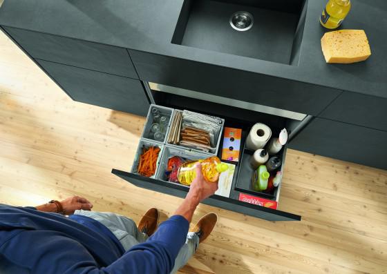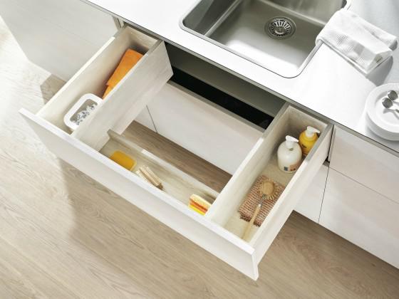 Met een u-vormig uitgesneden voorraadlade vul je de ruimte links en rechts van de spoelbak perfect op: een ideaal opbergsysteem voor spullen die je het meest nodig hebt, maar liever niet op je aanrecht laat staan.